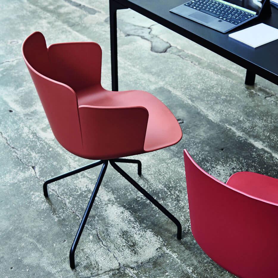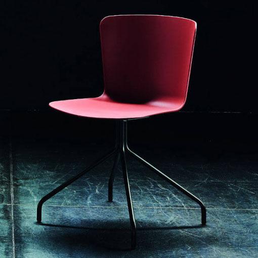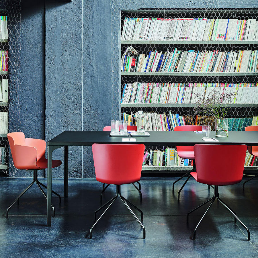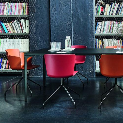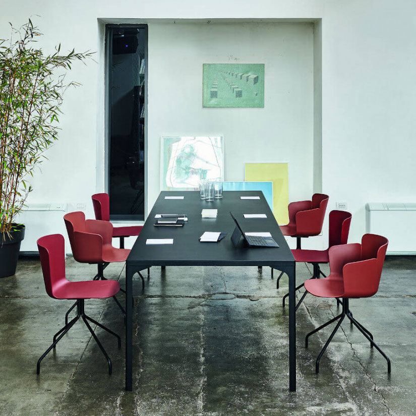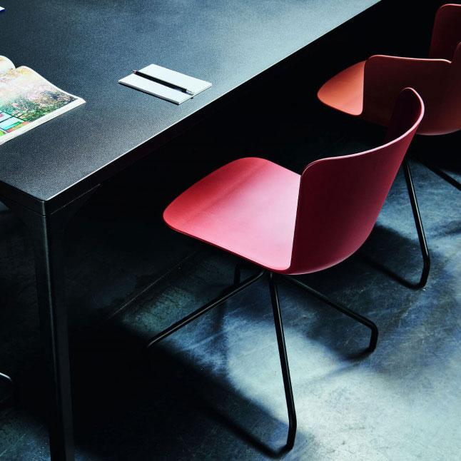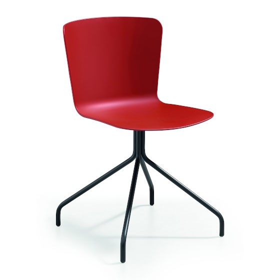 Calla chair on fixed trestle with four ways base in lacquered steel. Polypropolene seat. The chair is suitable for outdoor use. Optional: fixed cushion for the seat upholstered in leather, faux leather or fabric. The chair is also available in the version with armrests and upholstered, with and without armrests.