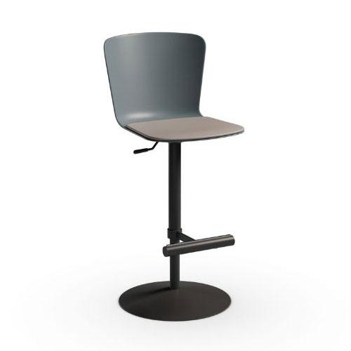 Calla swivel and height adjustable stool with metal base and seating in polypropylene. Seat upholsterein in fabric, leather or faux leather.