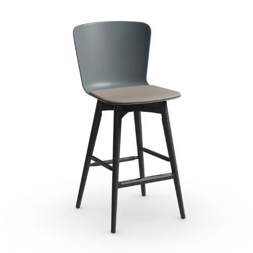 Fixed Calla stool with lacquered ash wood base and polypropylene seat. Seating upholstered in fabric, leather and faux leather.