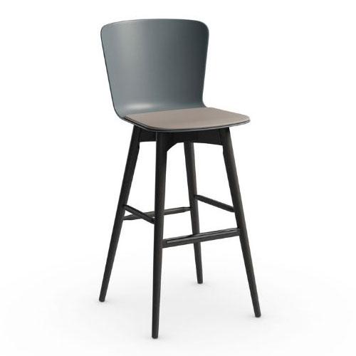 Fixed Calla stool with lacquered ash wood base and polypropylene seat. Seating upholstered in fabric, leather and faux leather.