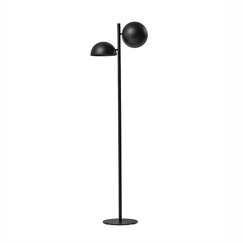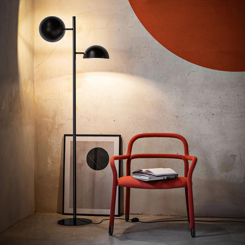 Direct light floor lamp. The lamp is made with a metal base and structure to which two adjustable lampshades are anchored. The lamp is available in the single black variant. The collection is inspired by the Bauhaus current, proposes geometries simplified to the maximum, almost abstract, easily legible with respect to space.