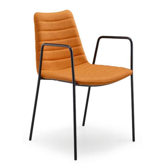 Cover armchair with four leg frame in chrome or lacquered metal. Shell upholstered with leather, faux leather or fabric.