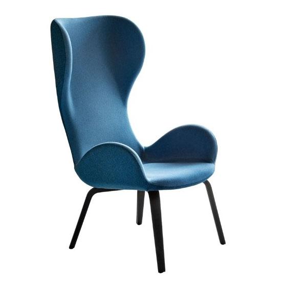 Dalia armchair with high backrest and wooden base. Seating upholstered in fabric, leather or faux leather.
