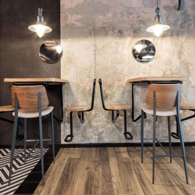 Stool with four-legs base in painted steel. Seat and backrest in leather, faux leather or fabric. Optional: wooden backrest’s back face.