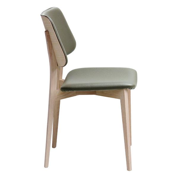 Chair with four leg frame available in different finishes. Seat and backrest upholstered with leather, ecoleather, fabric or custom’s fabric. This version is avaiable with backrest’s front face upholstered and backrest in wooden finish.