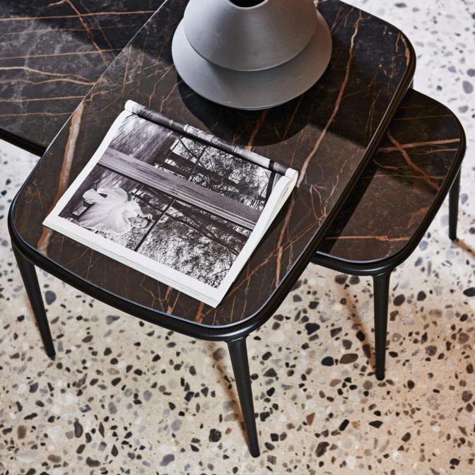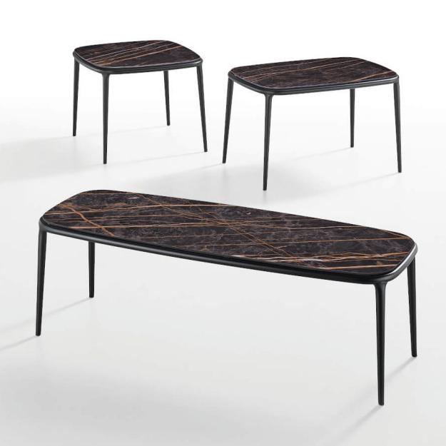 Lea coffee table with four legs base in lacquered metal. Top in wood or ceramic. Table is available in three different sizes and is suitable for overlapping games.