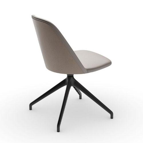 Lea chair with fixed trestle base in metal with self-return mechanism. Seating upholstered in leather, faux leather or fabric. Back of the backrest covered in wood.