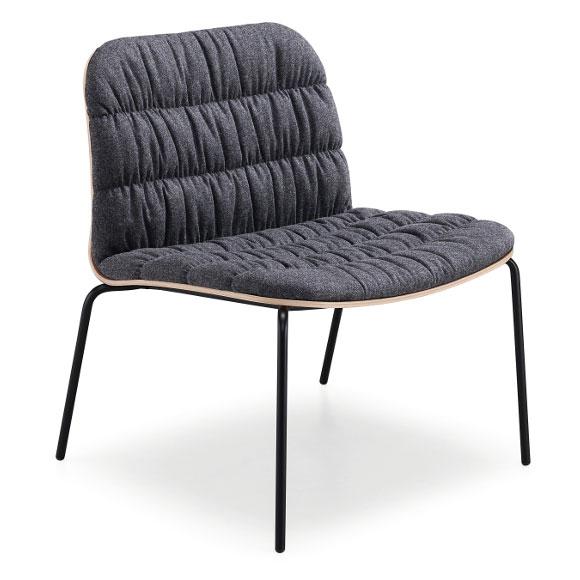 Lounge with four legs base in lacquered steel. Wooden shell or upholstered in leather, ecoleather, fabric or custom’s fabric. Available version with wooden back face.
