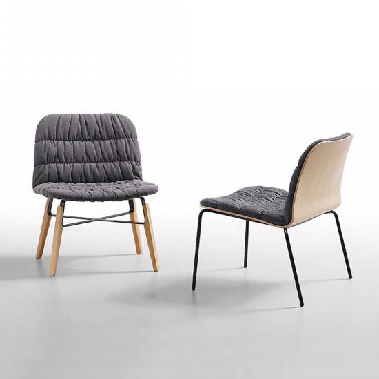 Lounge with four legs base in wood and lacquered steel. Wooden shell or upholstered in leather, ecoleather, fabric or custom’s fabric. Available version with wooden back face.