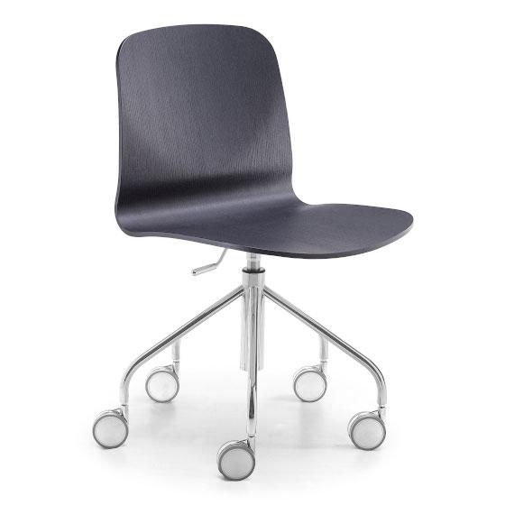 Liù operative chair on wheels, swivel and height adjustable. Five-ways base in steel, wooden shell.