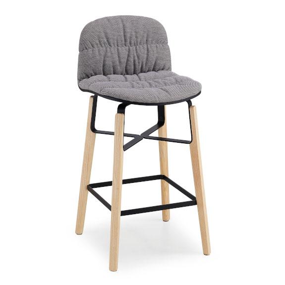Stool with four-legs wooden base and lacquered metal insert. Shell upholstered in leather, faux leather or fabric with the particular “wrinkle” lavoration. Optional: wooden back face.