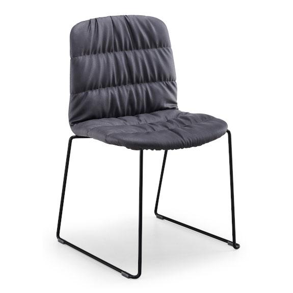 Liù chair with sled base in lacquered steel. Upholstered shell in fabric, faux leather or leather with particular “wrinkles” lavoration.