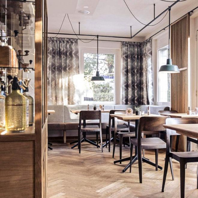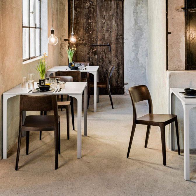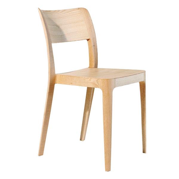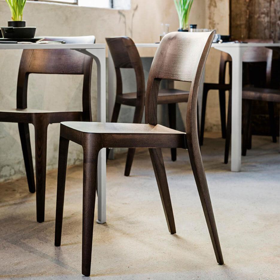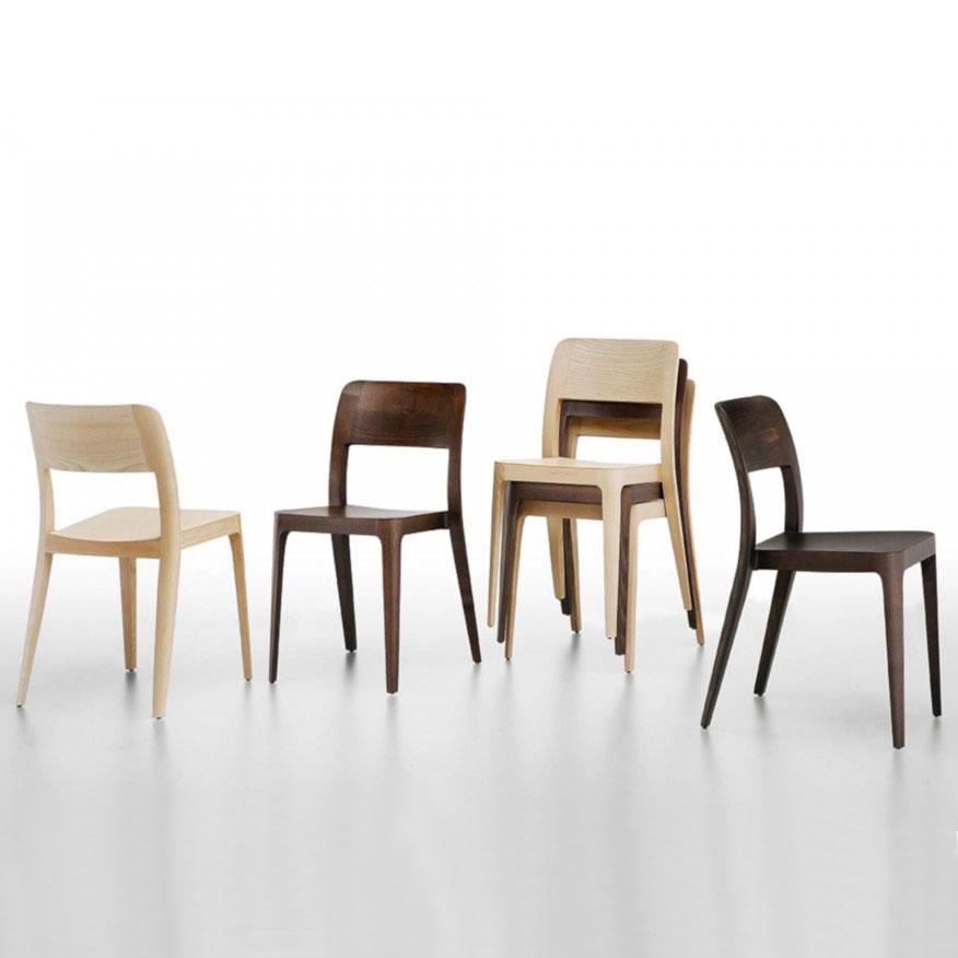 Nenè chair with four leg wooden frame is stackable up to eight pieces.