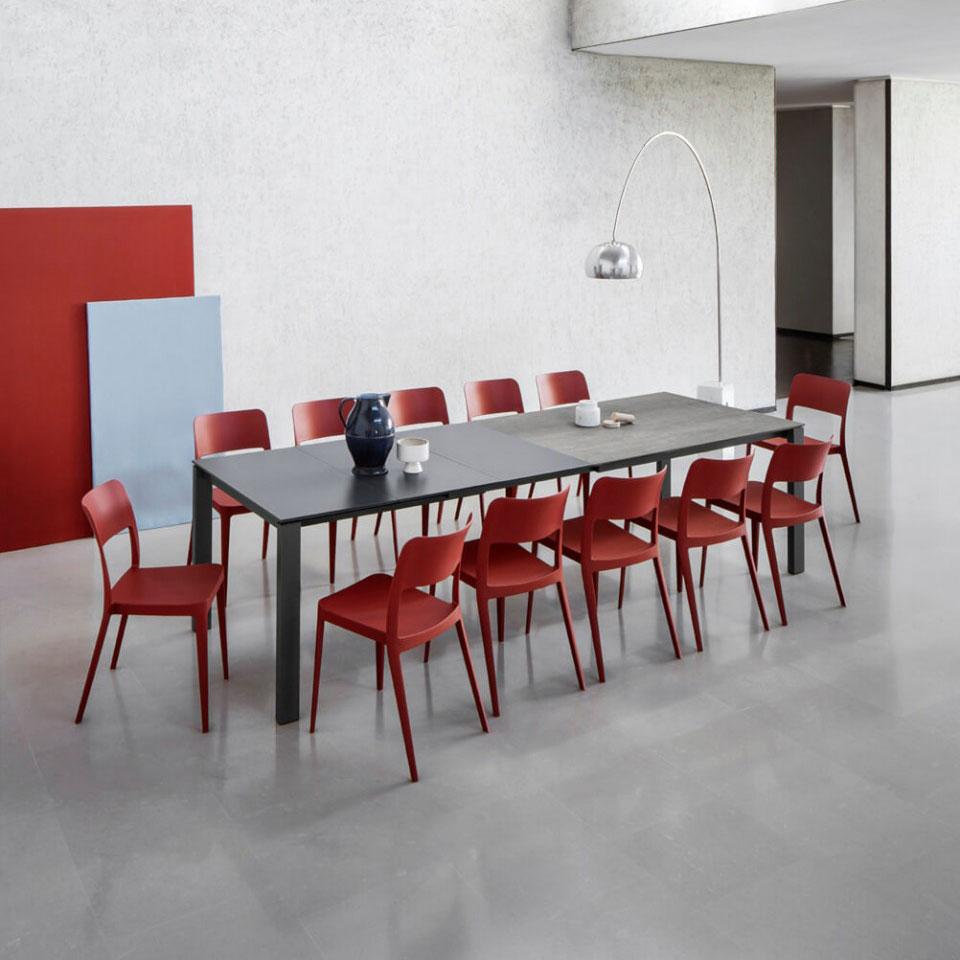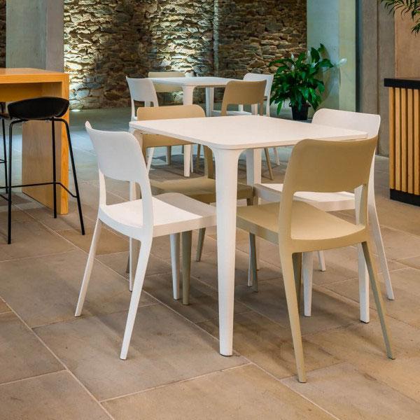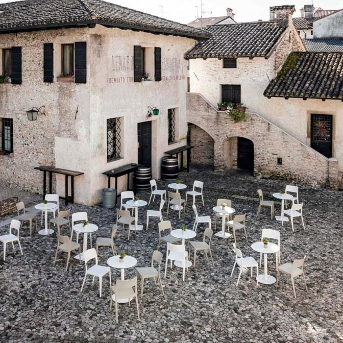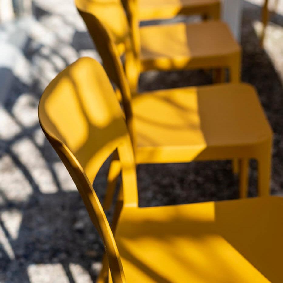 Suitable for outdoor use, it’s available in different colours. Stackable up to ten units. It has the CATAS certification.
