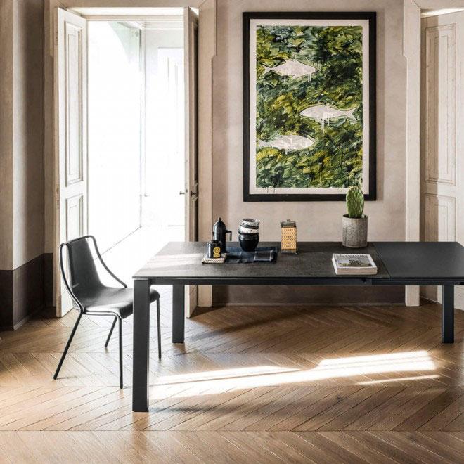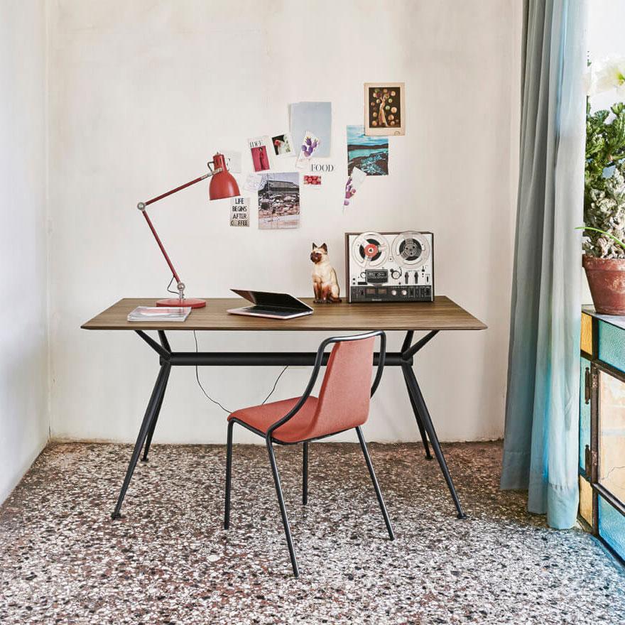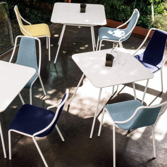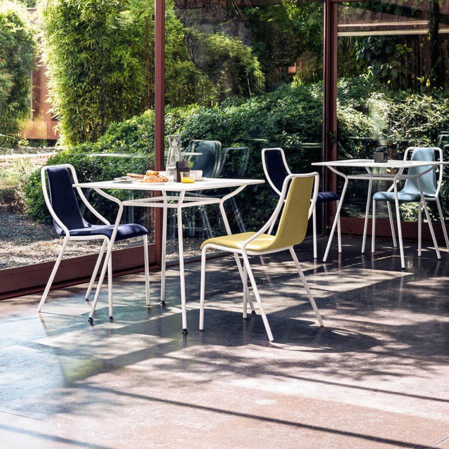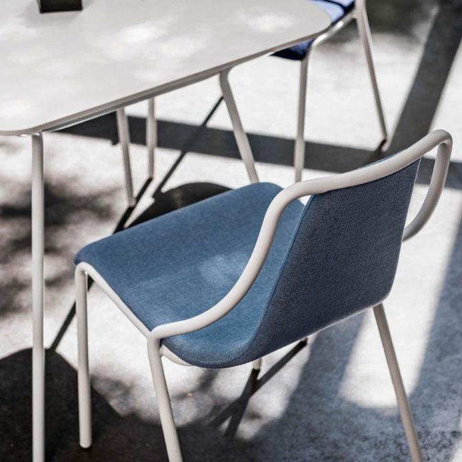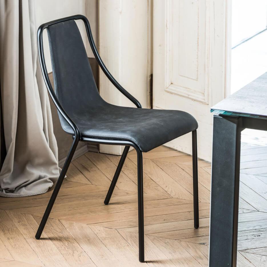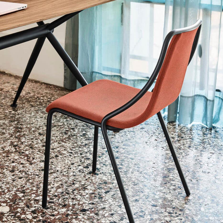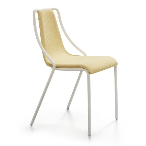 Ola chair with four leg frame in lacquered metal. Shell upholstered with leather, faux leather or fabric.