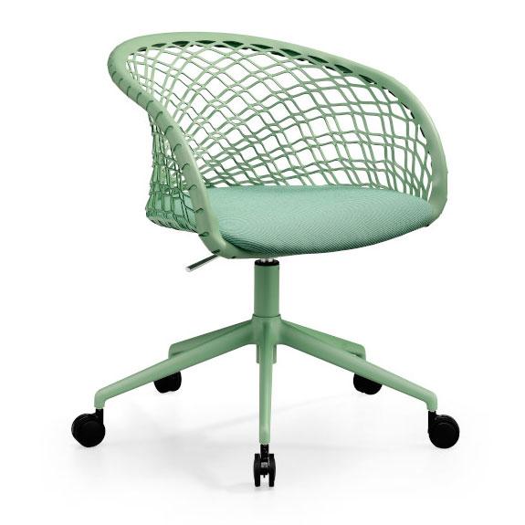 Swivel height adjustable armchair with five ways base in steel on wheels. Backrest made of TK hide or tuscan hide, seat upholstered in hide, faux leather, fabric or customer’s fabric.