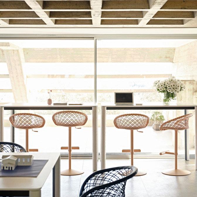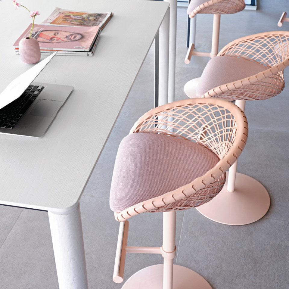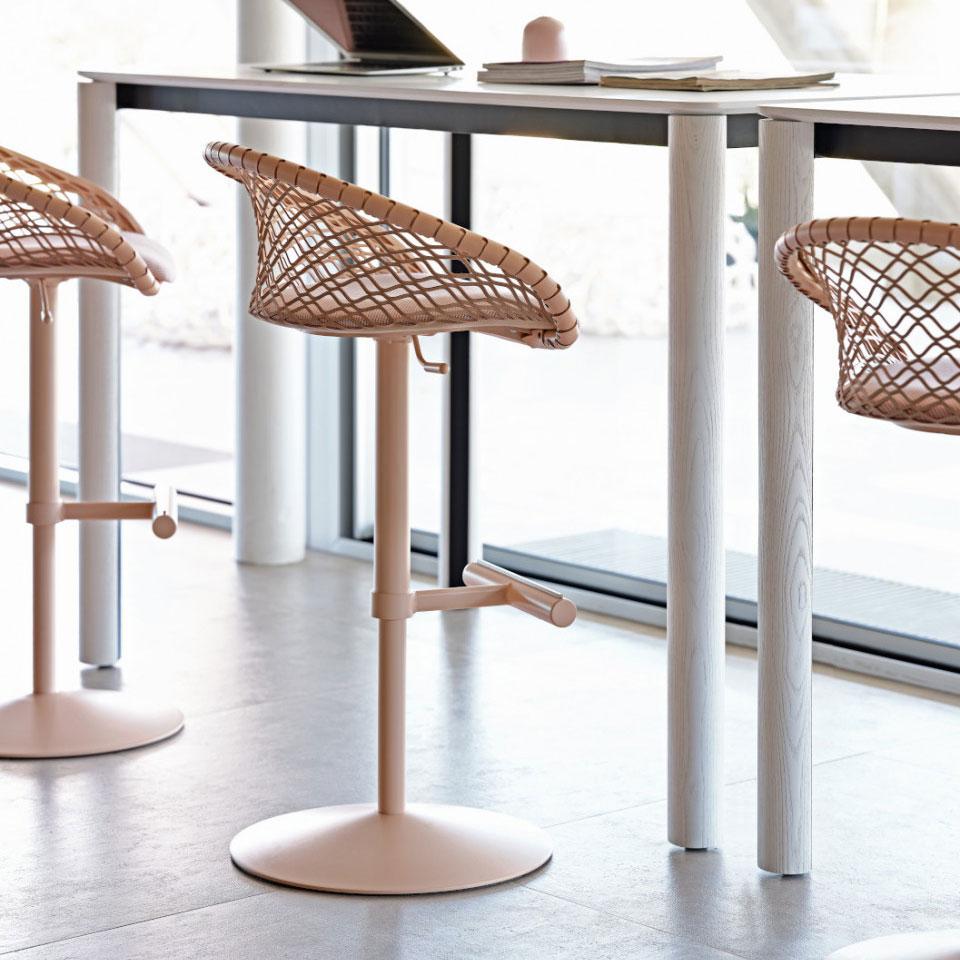 When the P47 stool is part of the furniture, workspaces are enriched with style and elegance. It is functional, equipped with adjustable height and footrest, and versatile thanks to the monochrome base that allows original color combinations.