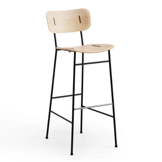 Stool with four-legged metal base. Seat and backrest in ash, walnut or oak veneered wood with metal inserts in the same color as the structure. Wing nuts in black or red metal. Available also in the H65 version.
