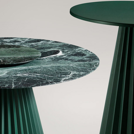 Plissé is available in the dining table version which can be combined with the Lazy Susan tray with swivel mechanism, bistro base and high bar table. The pleated motif gives the table a great sense of three-dimensionality and dynamism, and lends itself to multiple readings and combinations. Designed for the home, but also for hospitality, the Plissé collection marries all environments.