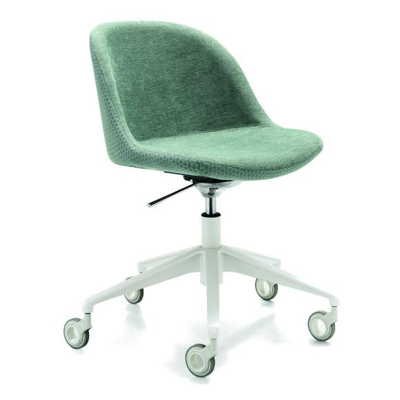 Task swivel chair with 5 ways base in lacquered steel. Chair fitted with gas mechanism for height adjustment. Shell upholstered in leather, faux leather, fabric or custom’s fabric.