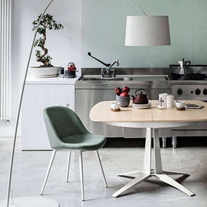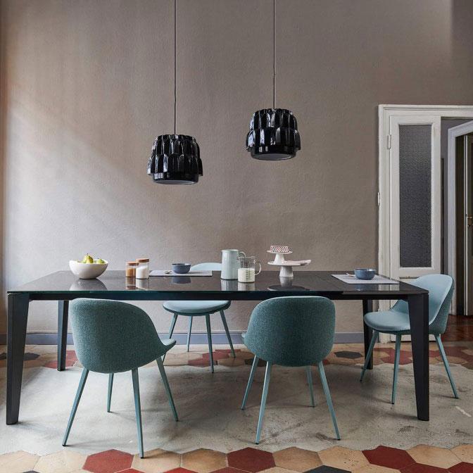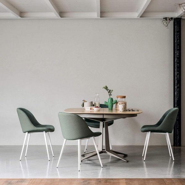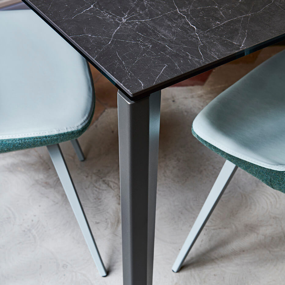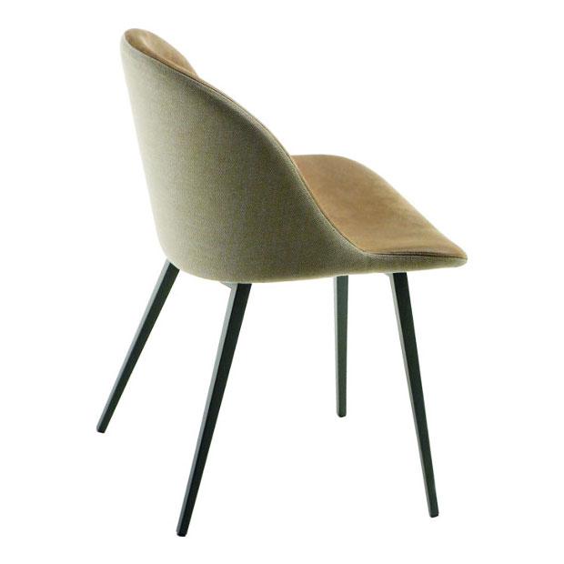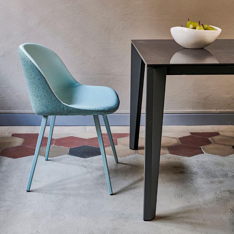 Chair with four square legs frame in lacquered steel. Shell upholstered in leather, ecoleather, fabric or custom’s fabric. Available the version with backrest upholstered with quilted ecoleather.
