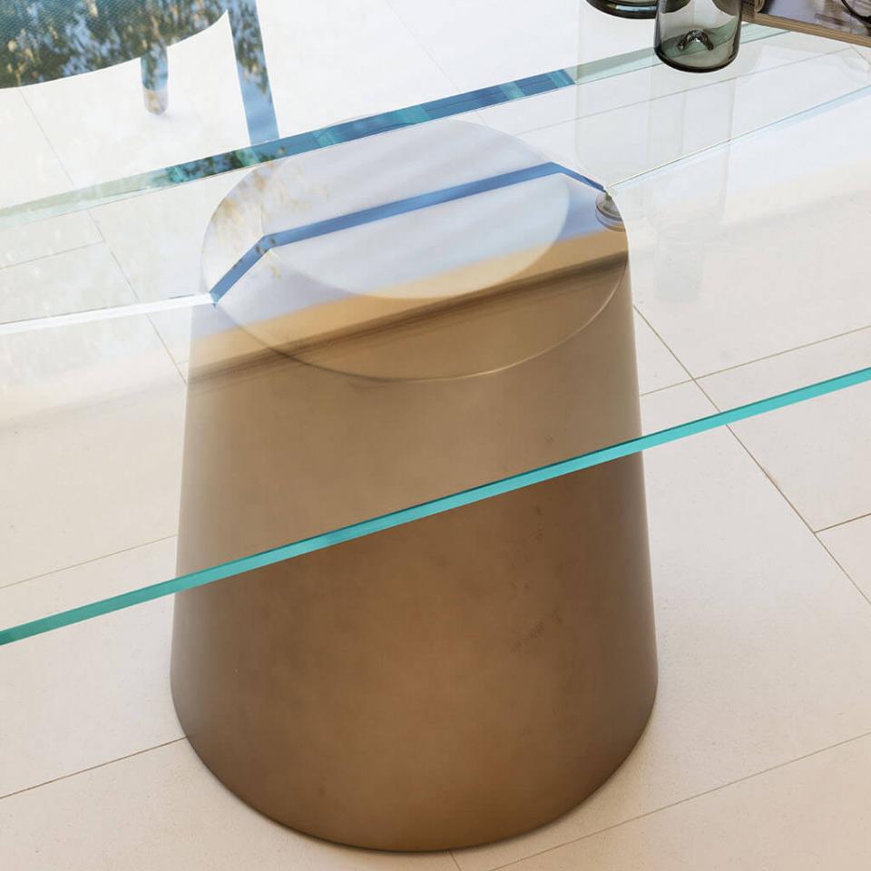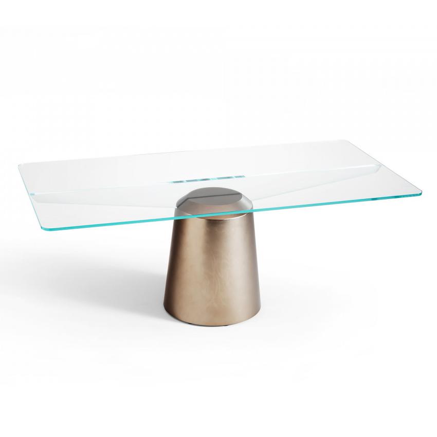 Spike, fixed table with central base in painted or matt galvanized metal. Rectangular or round top in transparent or smoked glass.