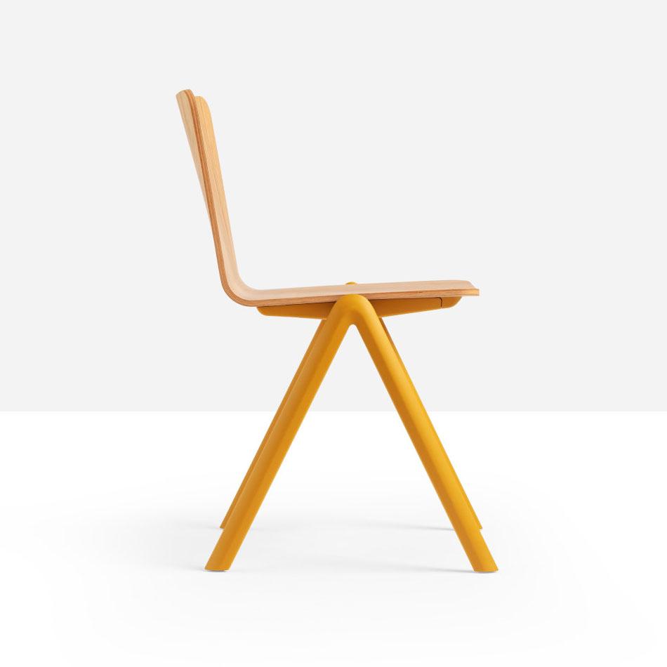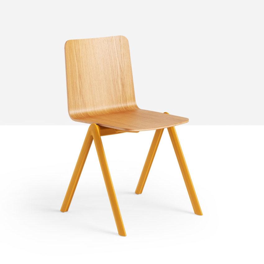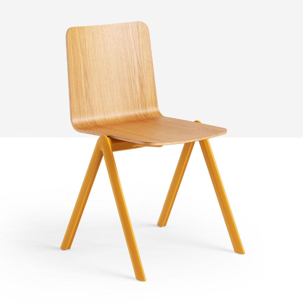 Stack stackable chair with four-legs base in polypropylene with shell in wood.