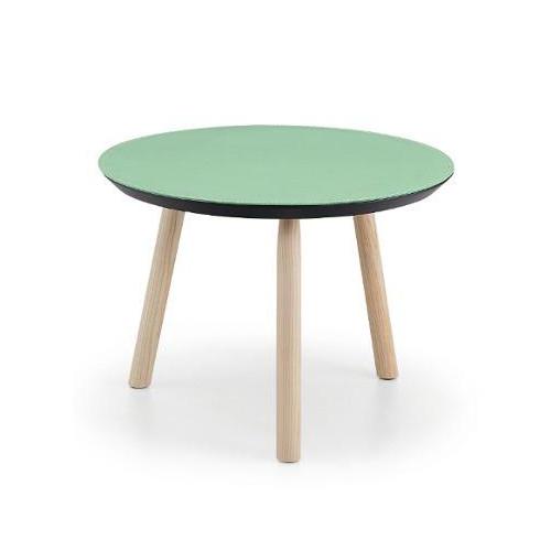 Suite coffee table with wooden three-leg base. Top in ceramic or upholstered in hide.
