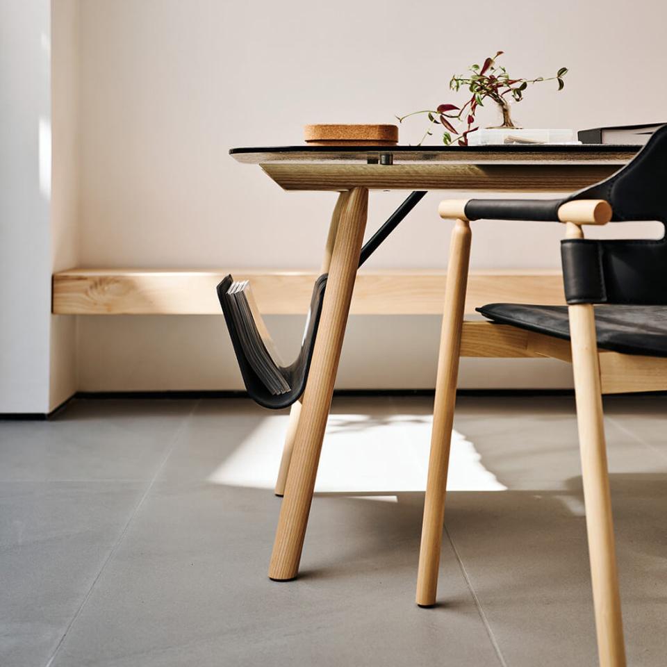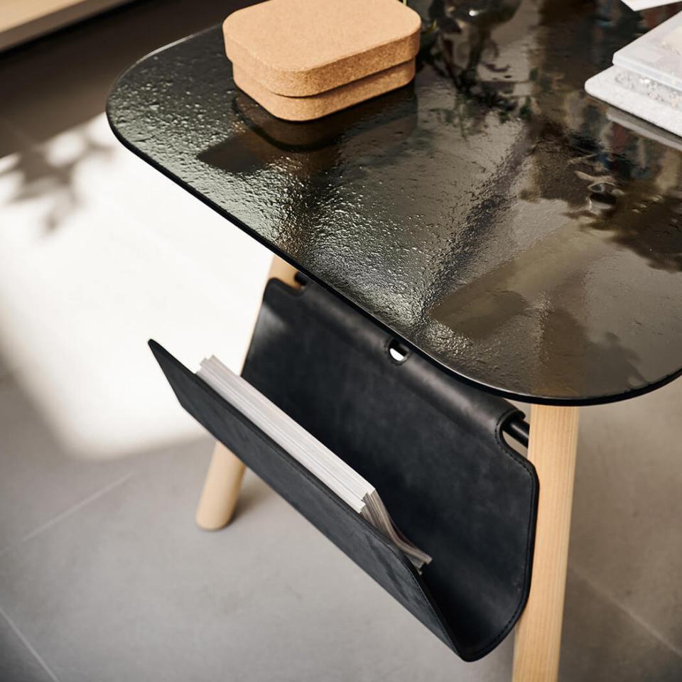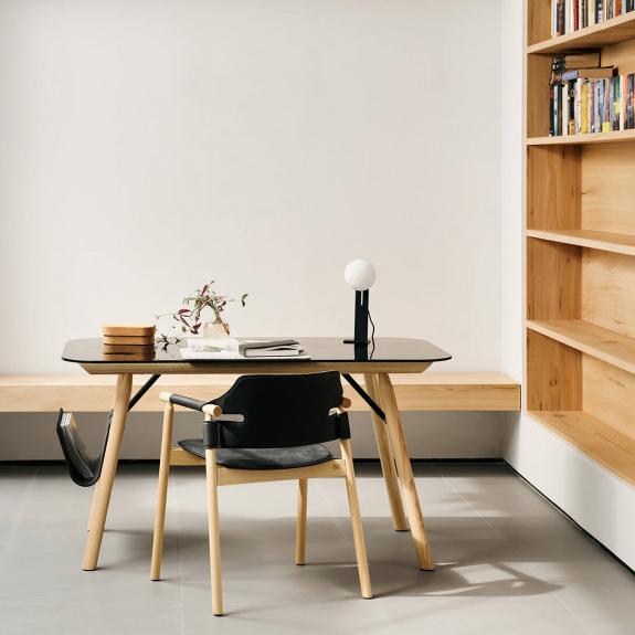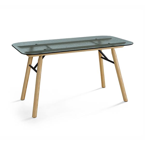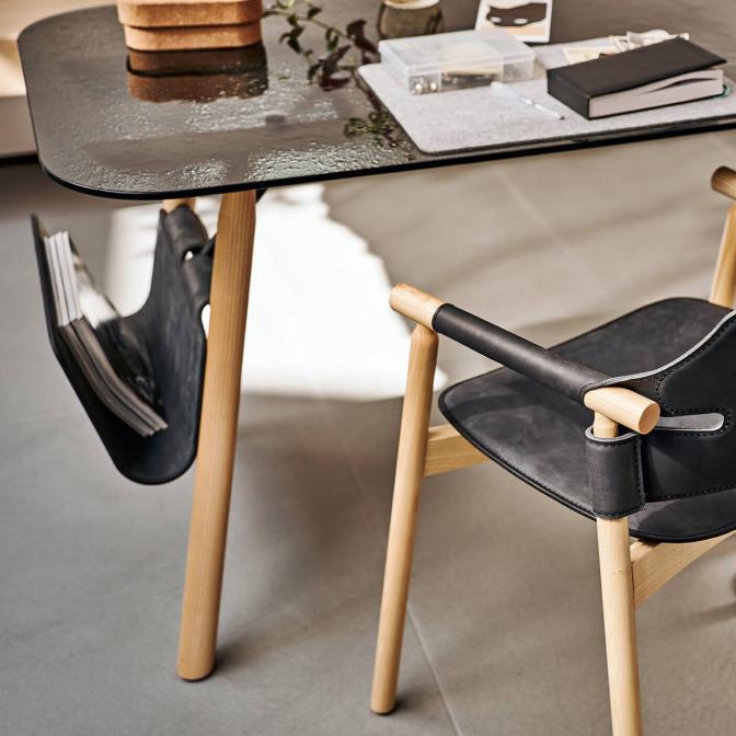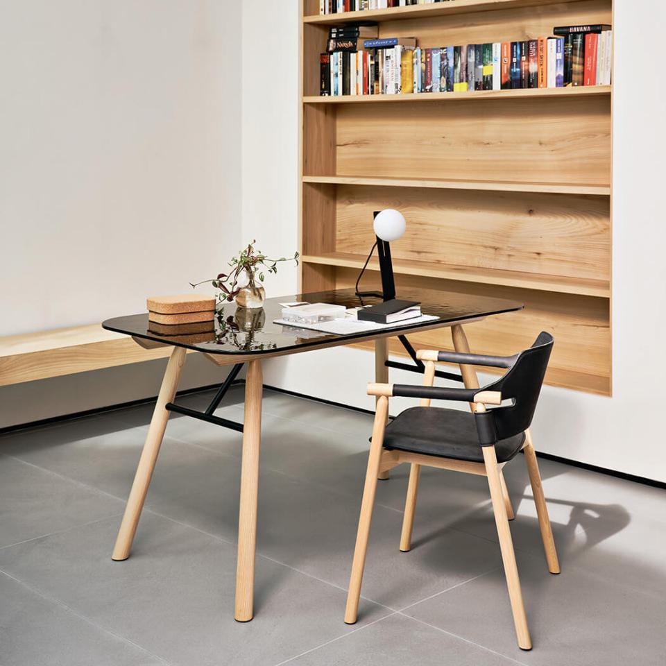 Suite desk with four-leg wooden base. Metal inserts and glass top. Optional: document holder in hide or Tuscan hide.