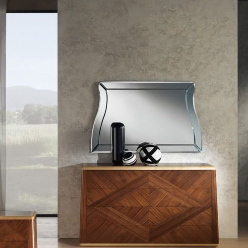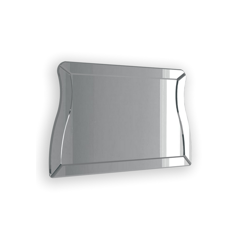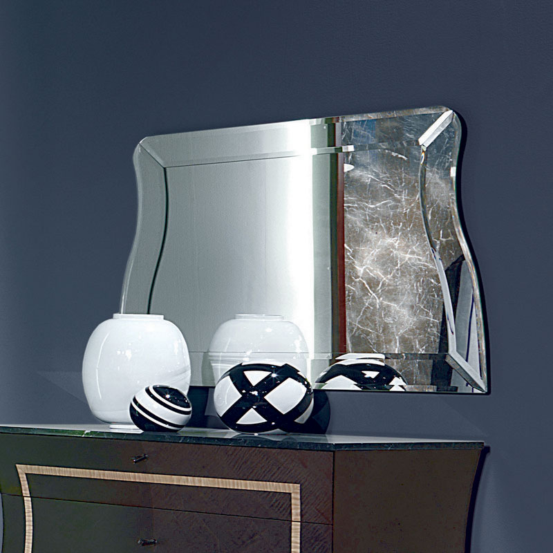 Mirror with a particular shaped shape. The design of the mirror is characterized by a glass frame with double grinding on the perimeters. Mirror in natural finish.