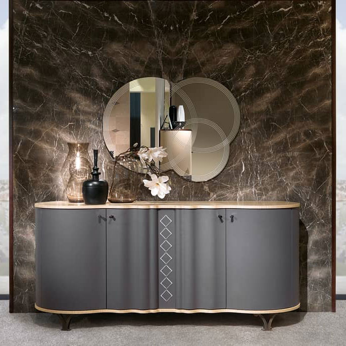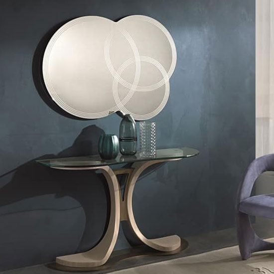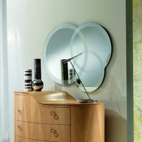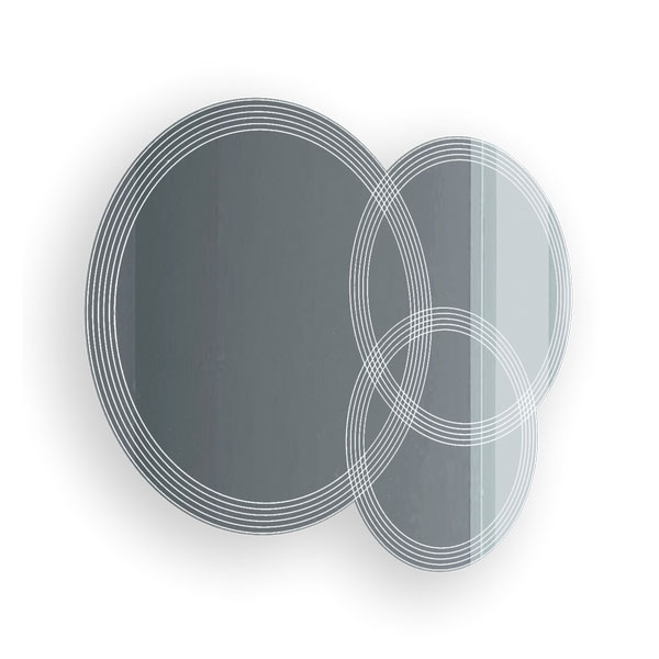 Iride mirror particular for its 3-circle shape. The product is enhanced by the sandblasting of many concentric circles. Mirror in natural finish.
