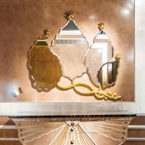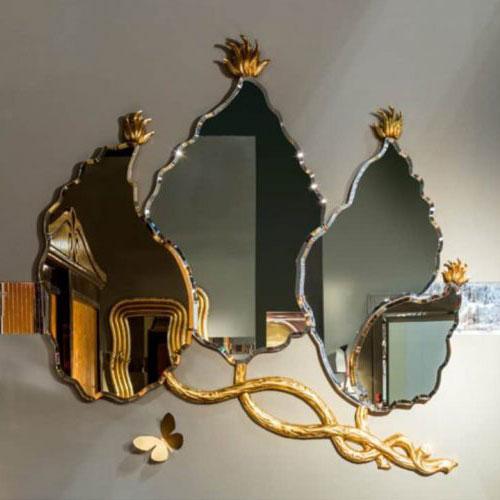 An artistic piece consisting of two central leaves with silver mirrors and two side leaves with bronze colored mirrors. The branch and the copings are hand-carved and covered in gold leaf.