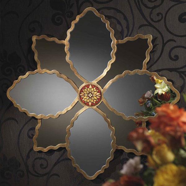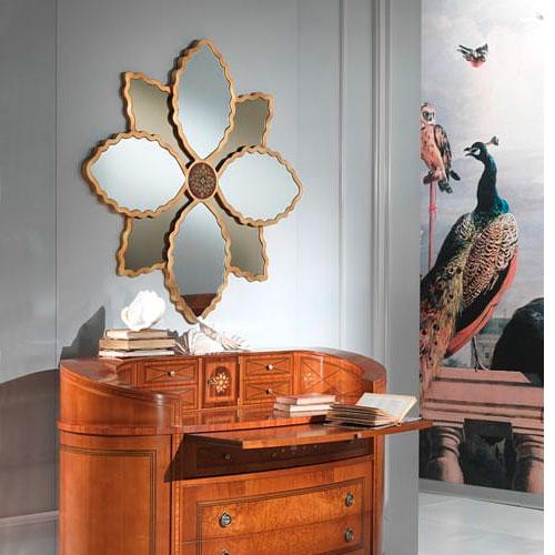 The profiles of the leaves, hence the name, are covered in gold leaf. Silver mirrors alternate with bronzed mirrors. Central inlay with leaf motif on a rosewood background.