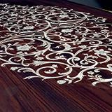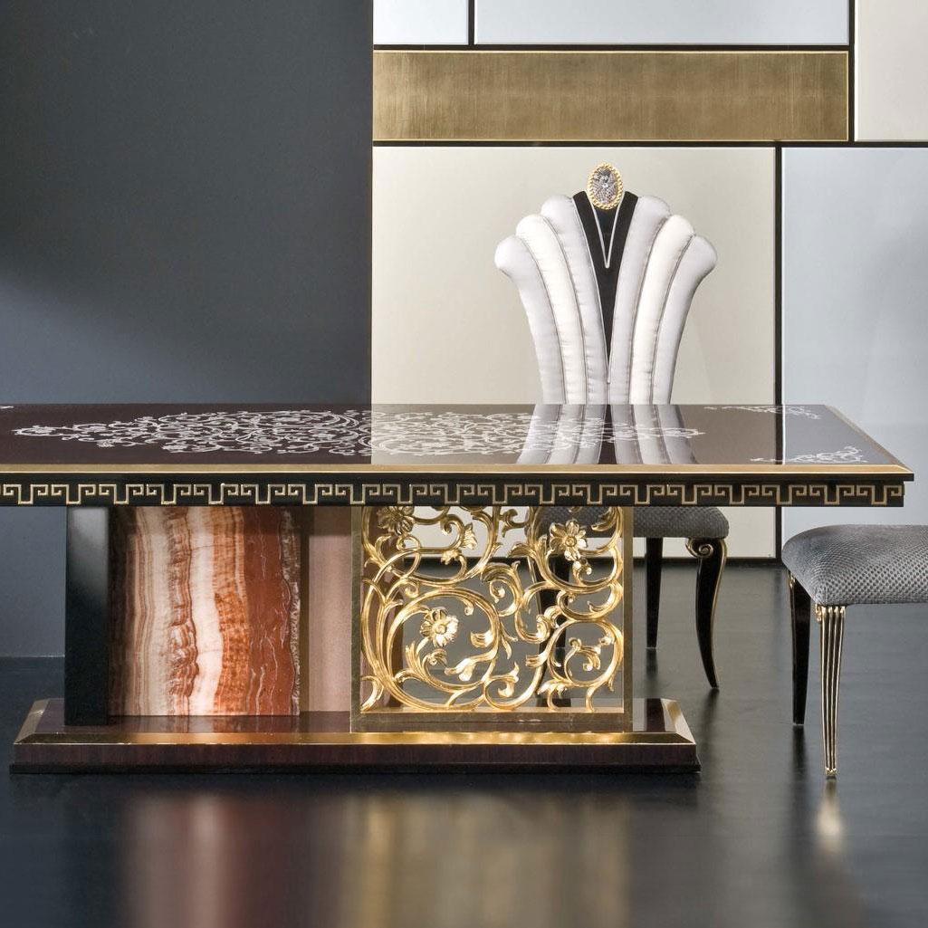 Dining table rosewood inlaid top, base in onyx marble, leather and carved gold leaf.
