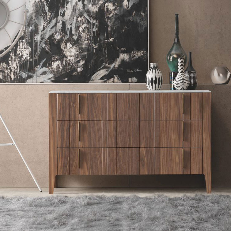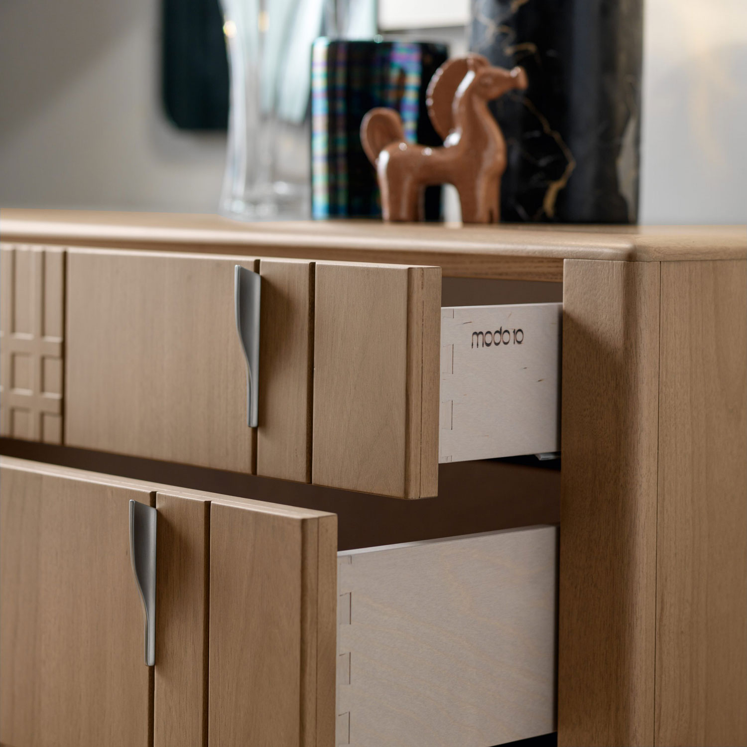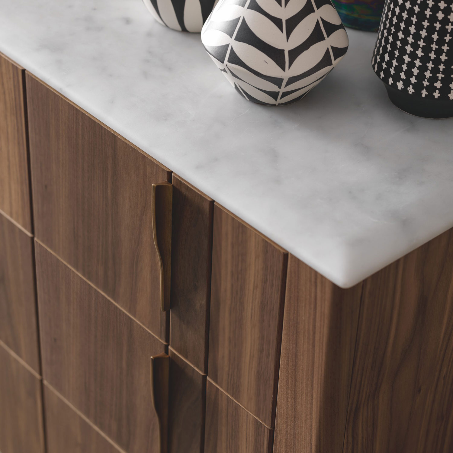In the world of Domino every style finds a proposal, and each proposal can be declined in a large number of variants. Domino is the possibility to customize each piece with solid wood staves of different processes: plain wood stave, striped stave, wood square stave and metal square stave. Solid and ductile, rigorous and creative, wood draws original textures on the doors, emphasizing the exclusivity of each piece of furniture, giving rise to an increasingly personal stylistic language.