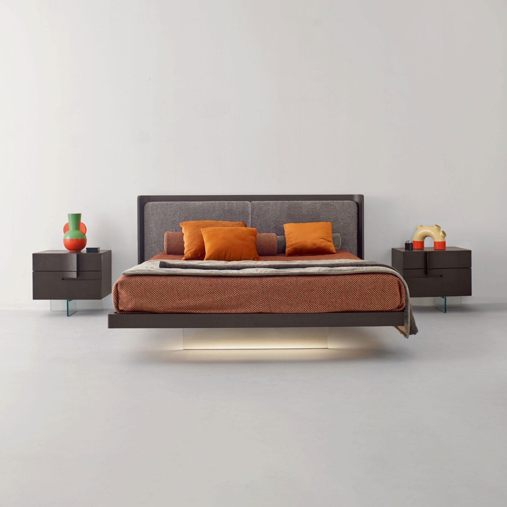 A feeling of lightness and balance guides the entire sleeping area. The Milà bed fluctuates between innovation and design thanks to the exclusive transparent glass foot with LED profile.