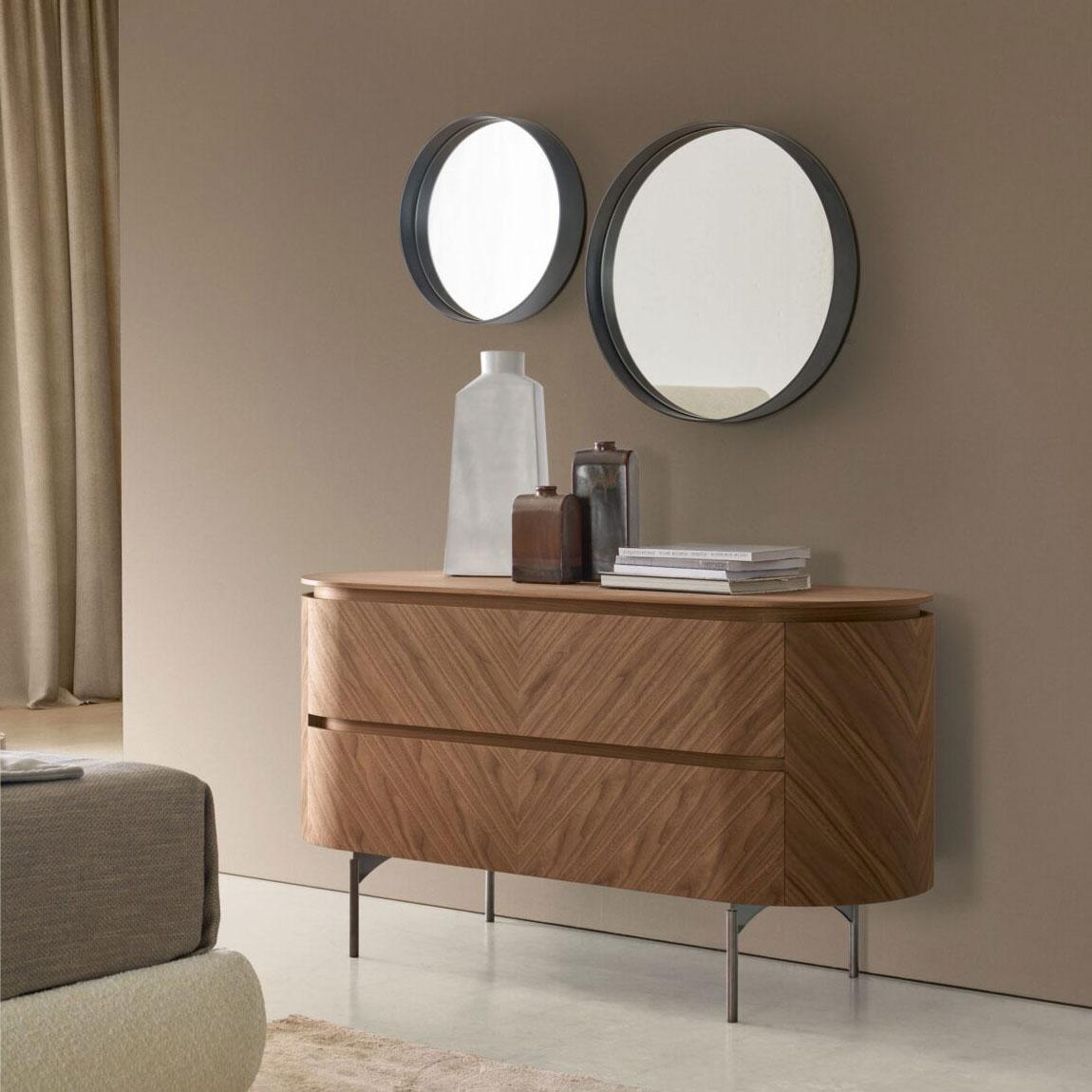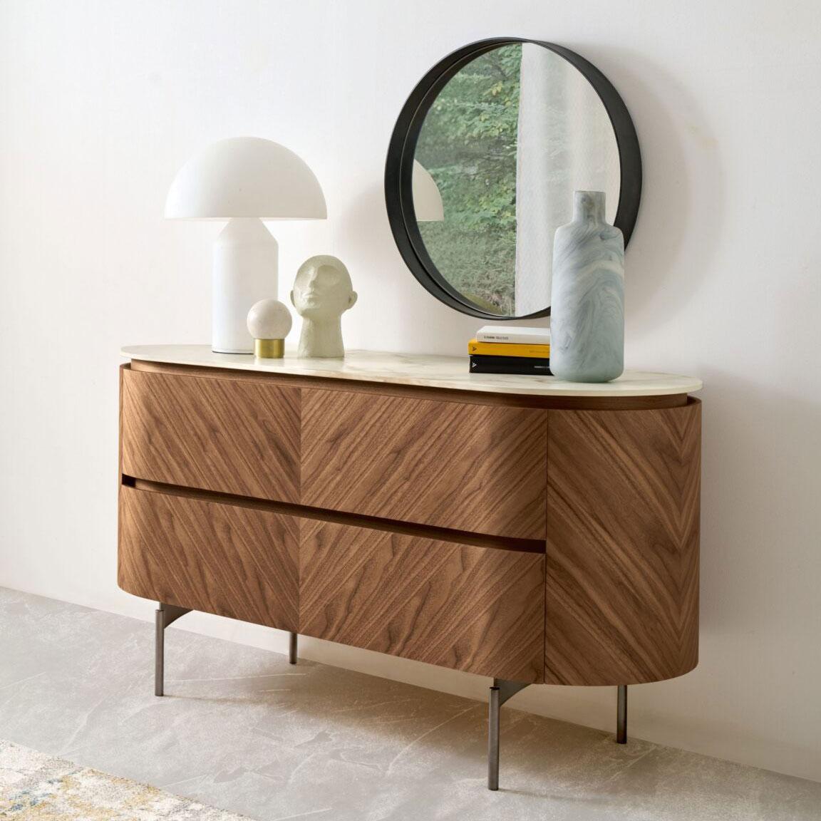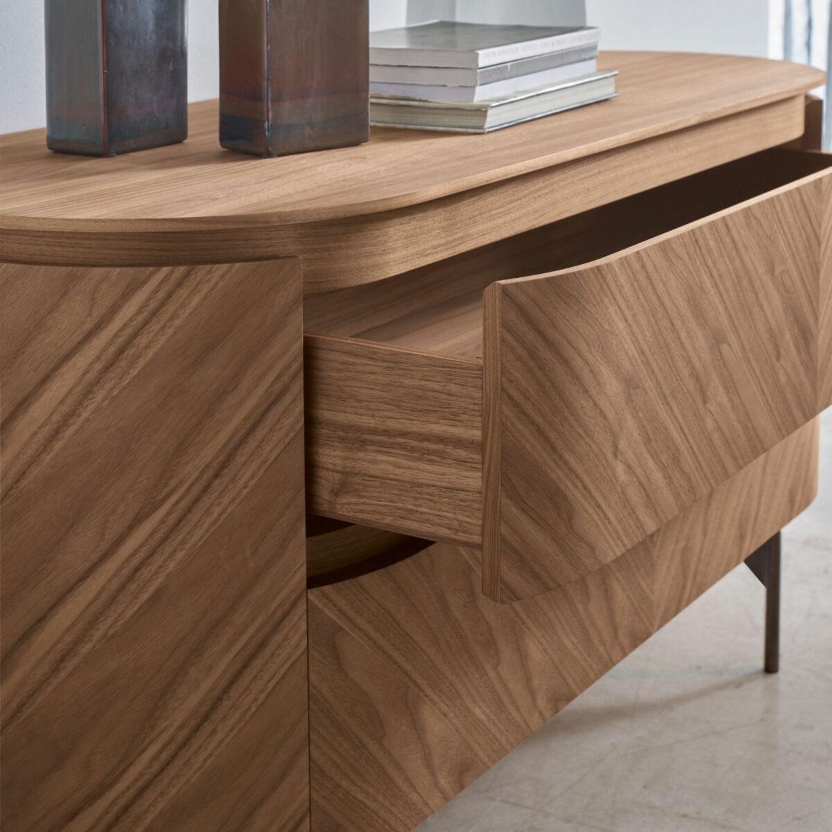 The Wood Dresser offers an extremely elegant design, featuring rounded ends and grooved handles that define a clean, minimalist form.