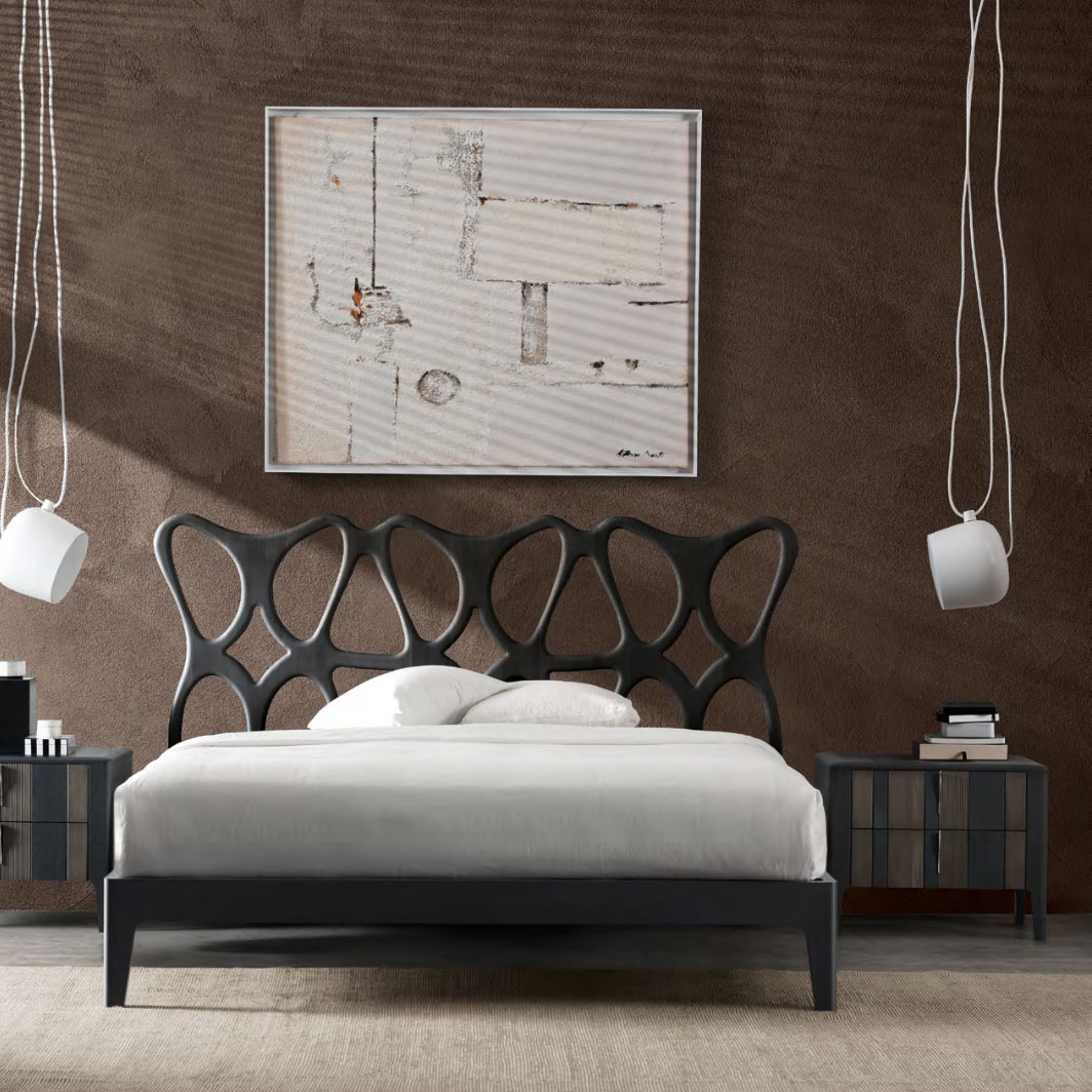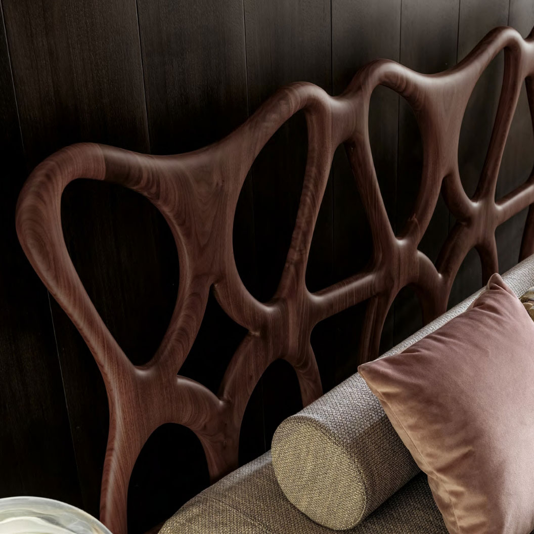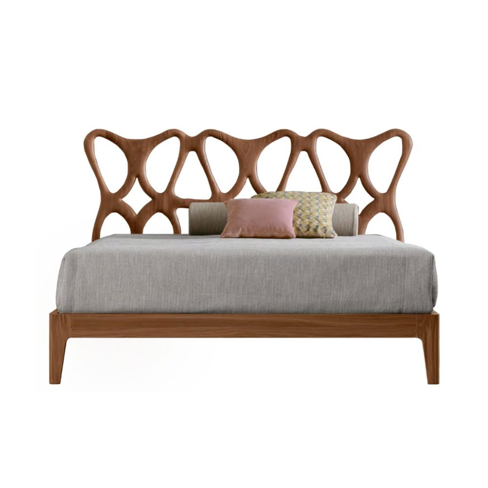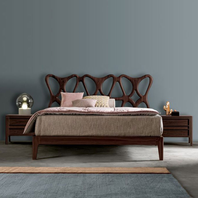 Slender, sculptural bed design in Canaletto Walnut wood.