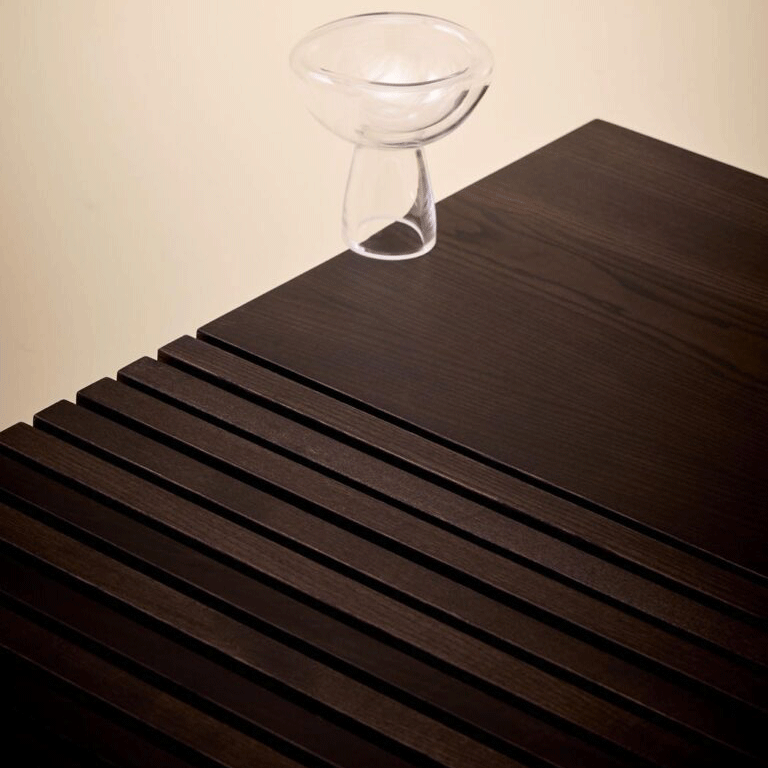 Functional, material and incisive in its design. The Raft coffee table, designed by Fabio Fantolino, chooses pure and rigorous geometries to assert its personality, capable of attracting attention and forging the features of a domestic environment. Its expressive force is defined not only by the wooden structure, available in different shades, but also by its stylistic figure studied in detail. The top extends and breaks down into vertical slats, while the optional matt and glossy lacquered inserts create a further possibility by translating the functionality of the classic tray into a more decorative character.