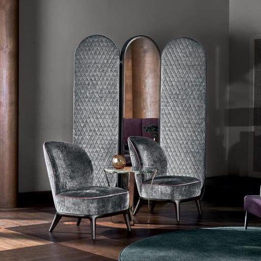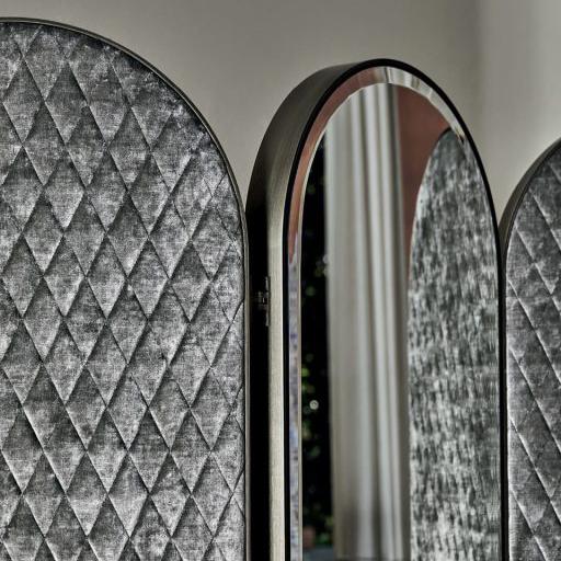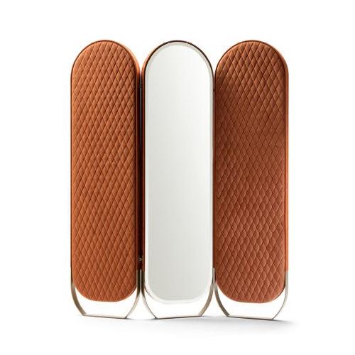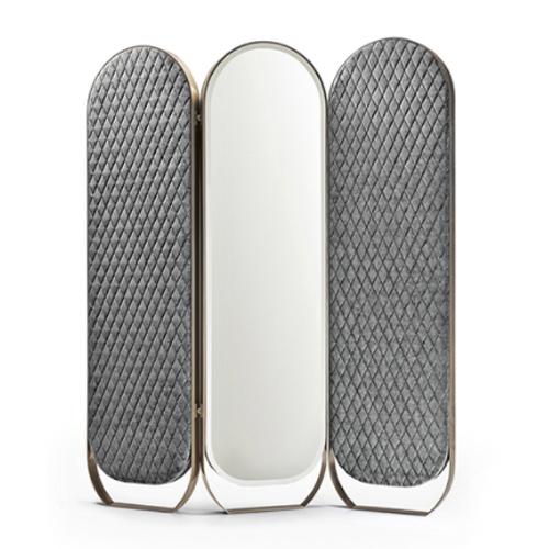 The Mascha metal screen is full of elegance, with its soft oval panels boasting an intricate quilted pattern on the front and giving the vanity area an aura of charm and class.