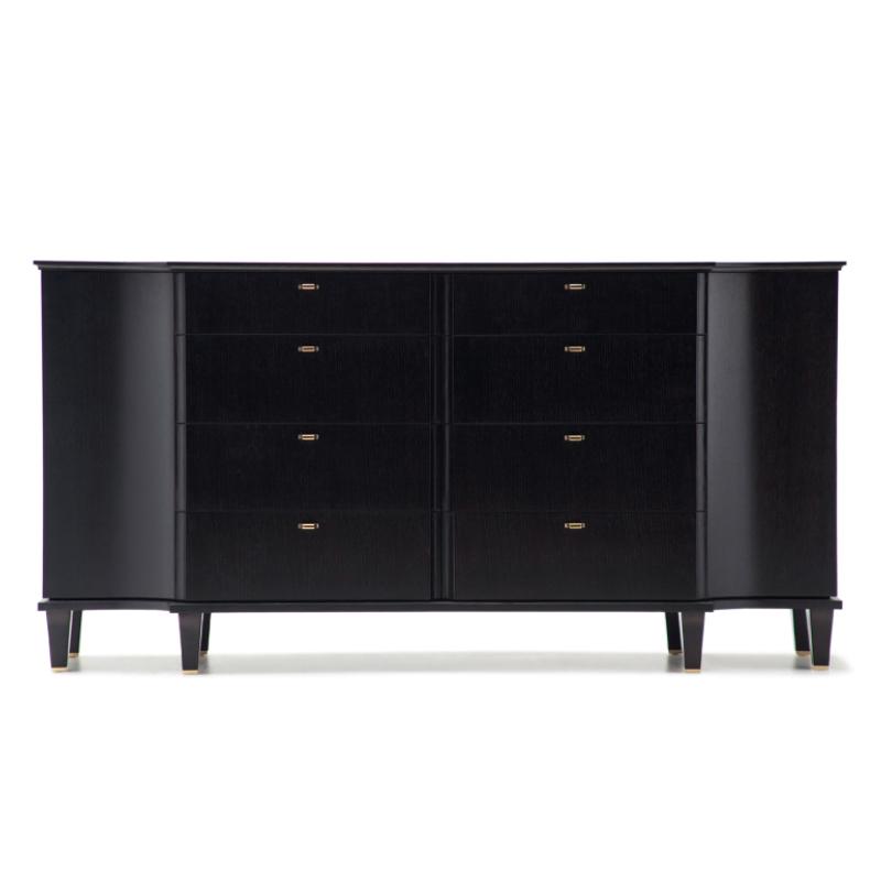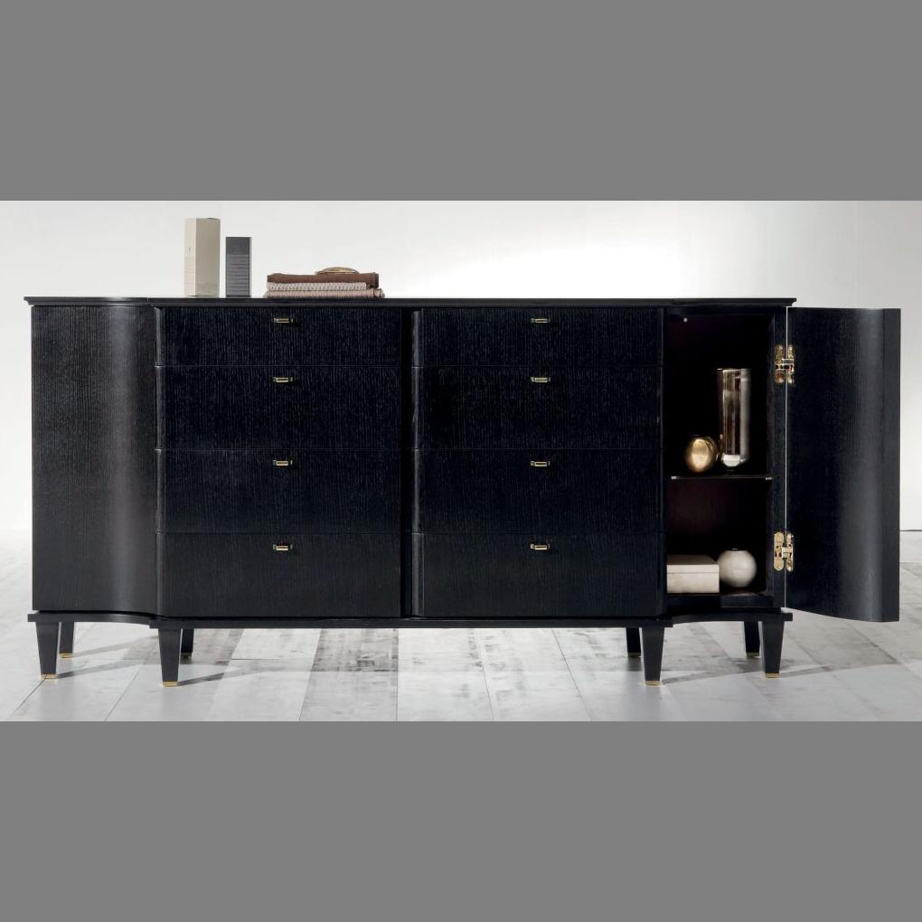 The Desiré chest of drawers with doors stands out for its refined design, characterized by an elegant groove that extends along the profile of the drawers and the two curved side doors. The inside of the doors offers ample space with glass shelves.