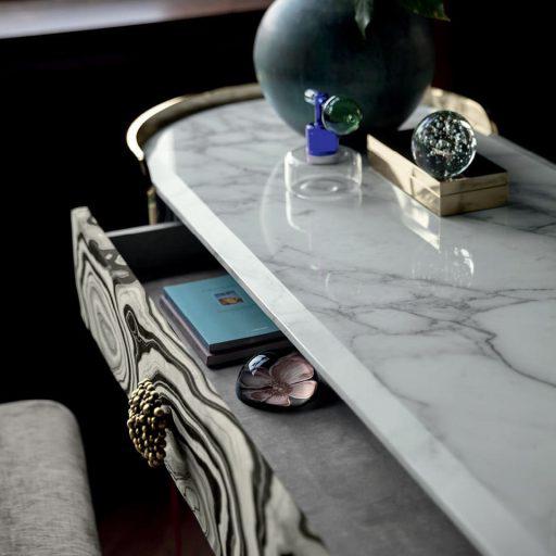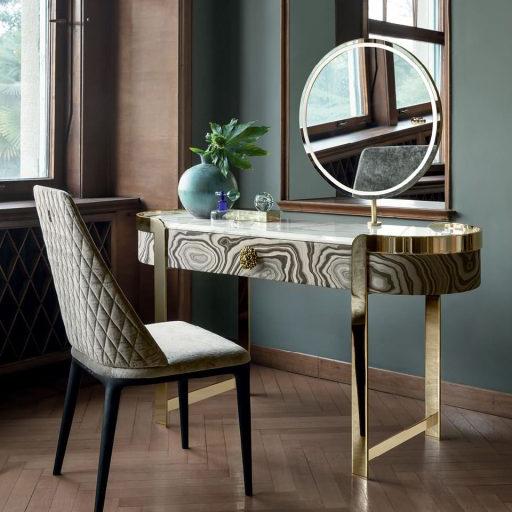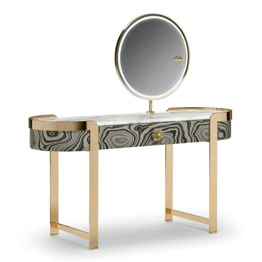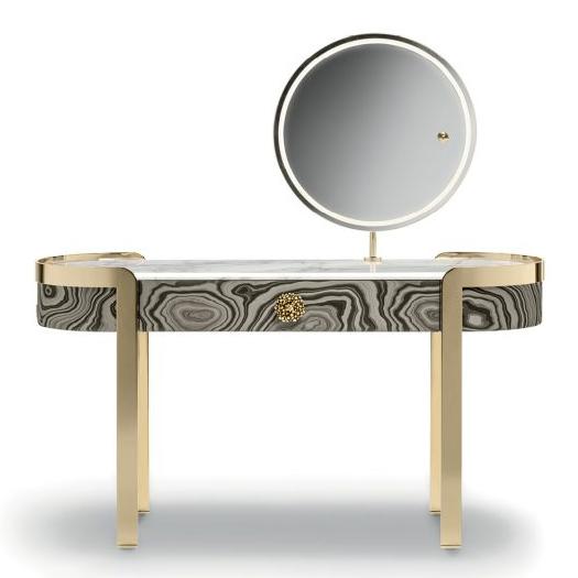 The Doris LED mirror-covered dressing table features precious details, a sculptural silhouette, metal legs and marble top. A unique piece that enriches the vanity corner in the sleeping area.