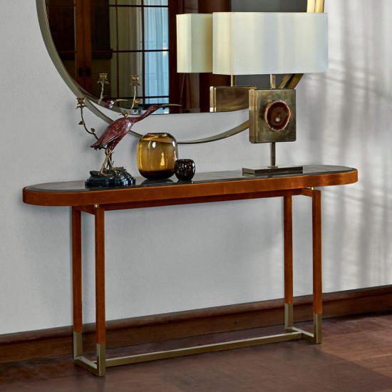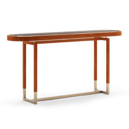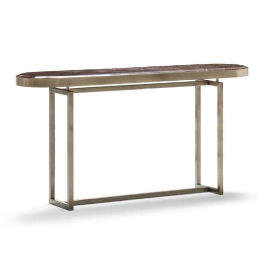 The Isabel oval metal console is characterized by an essential linearity, with a metal or leather-covered structure and a recessed marble top. The clean geometries give a modern charm ideal for functional and elegant spaces.