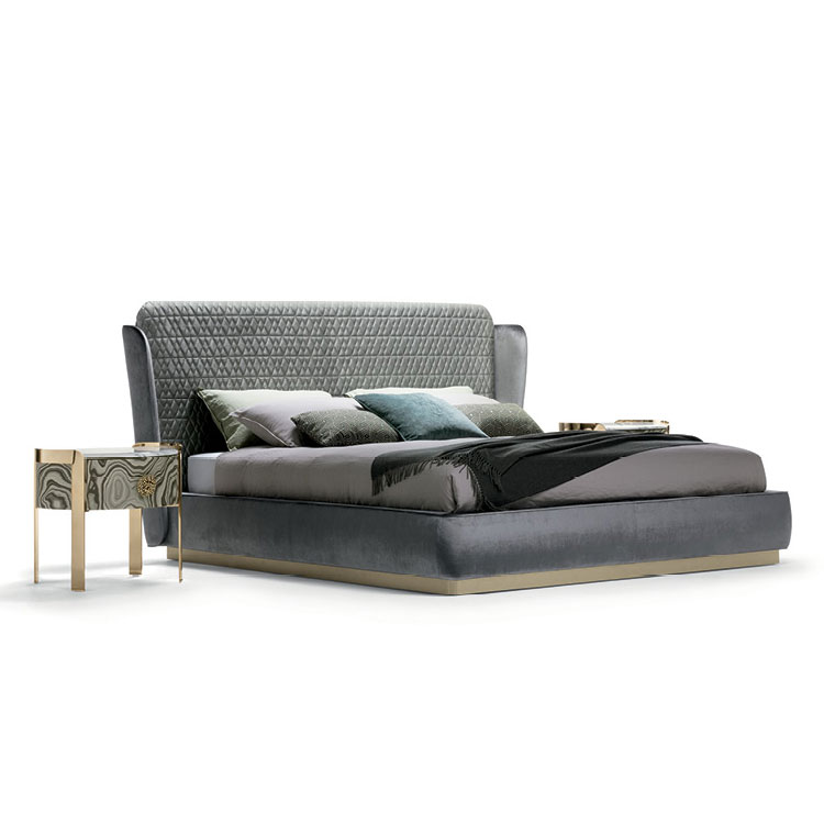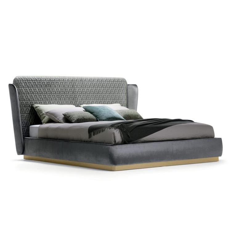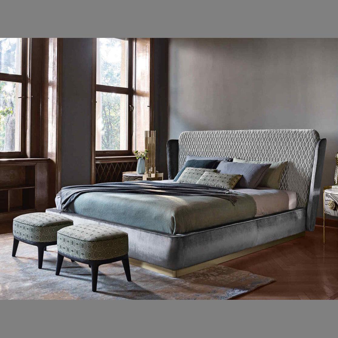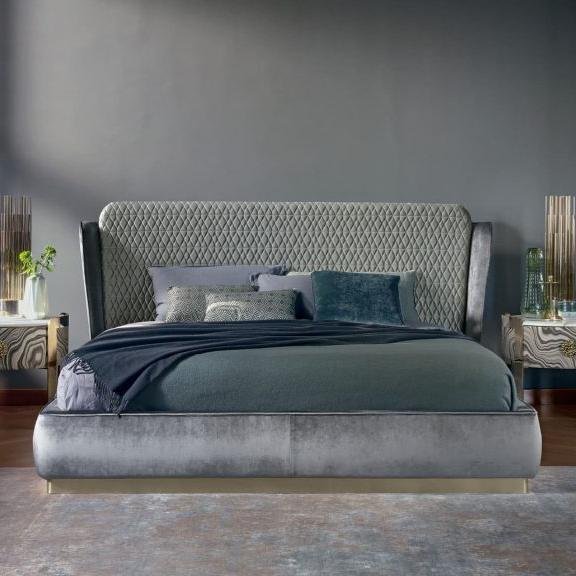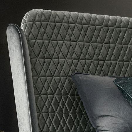 The double headboard, embellished with delicate diamond quilting, creates a fascinating contrast with the rounded corners. Each element is treated with precision and skill, giving the Janet bed a unique charm.