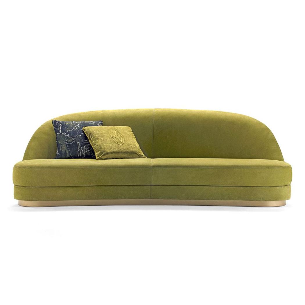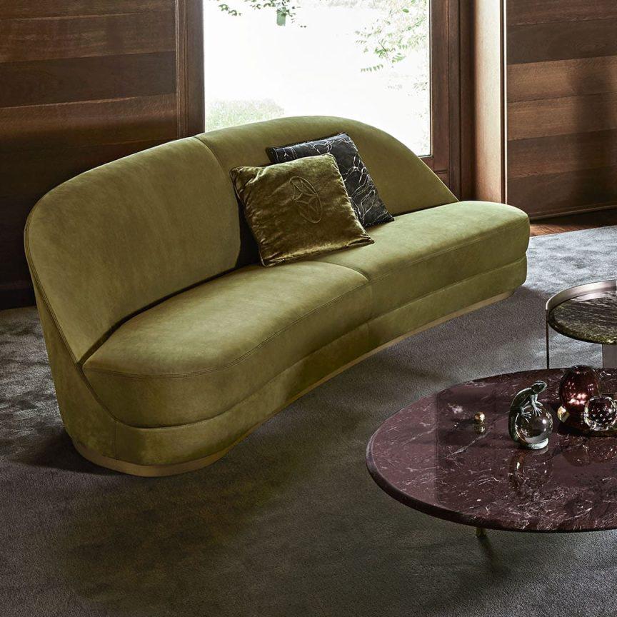The Kathy bean sofa made its debut at the Salone del Mobile in Milan in 2018. Since then, it has captured the public’s attention and continues to enjoy great success. The sophisticated design of the living area, with its combination of acid green Nubuck and golden base , is completed by the elegant Callas armchairs , made of fine Canaletto walnut wood and upholstered in velvet of the same shade of green.