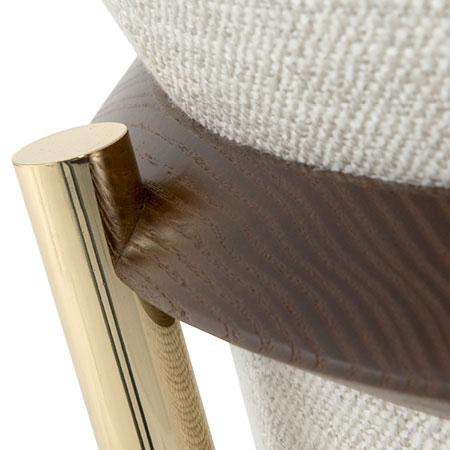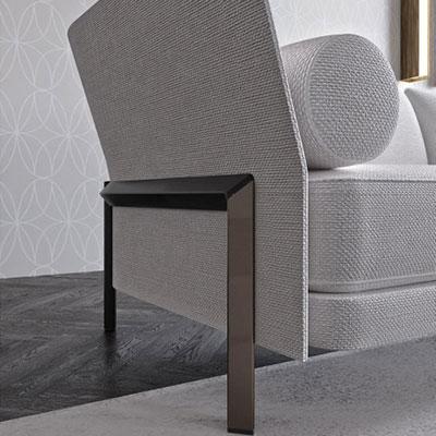 The New Cosmo sofa was born thanks to the cabinet-making tradition and attention to detail that distinguish the company. The structure in solid ash or canaletto walnut skilfully envelops the seat covered in fabric, creating a harmonious combination of noble and highly valuable materials. The rear legs in golden metal fit precisely into the triangular-section wooden structure, creating an elegant and sophisticated harmony of lines and shapes.