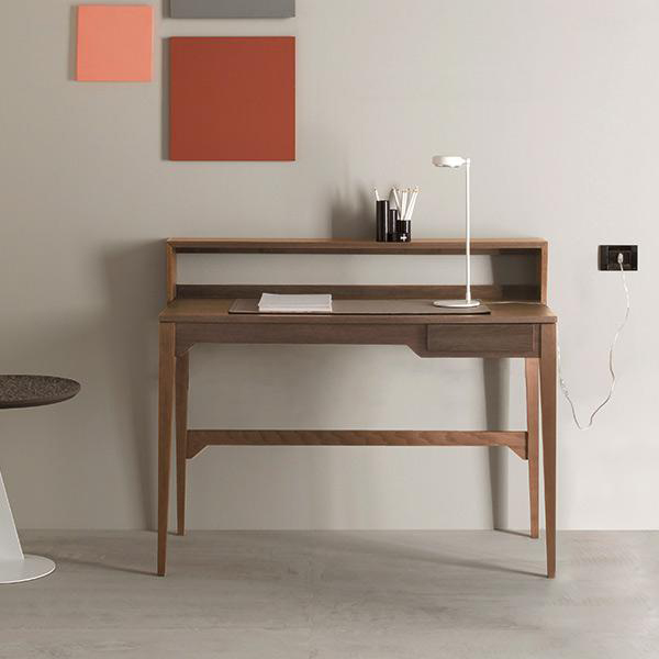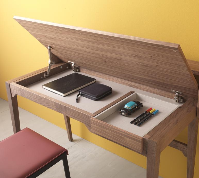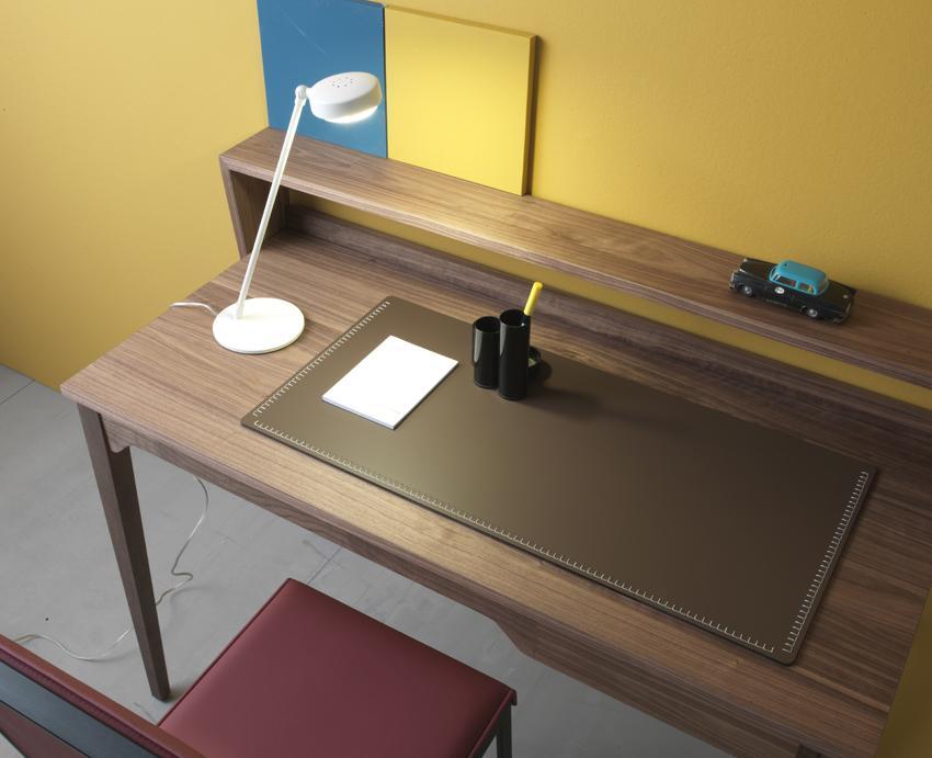 Pad Desk CA904 Desk with shelf in walnut wood or burned oak veneer, one drawer plus a opening lid compartment. Pad in mocha regenerated leather, matched stitching. Overall Dimensions; 47″ x 21″ x 29″ h.