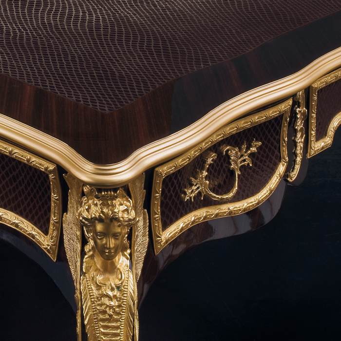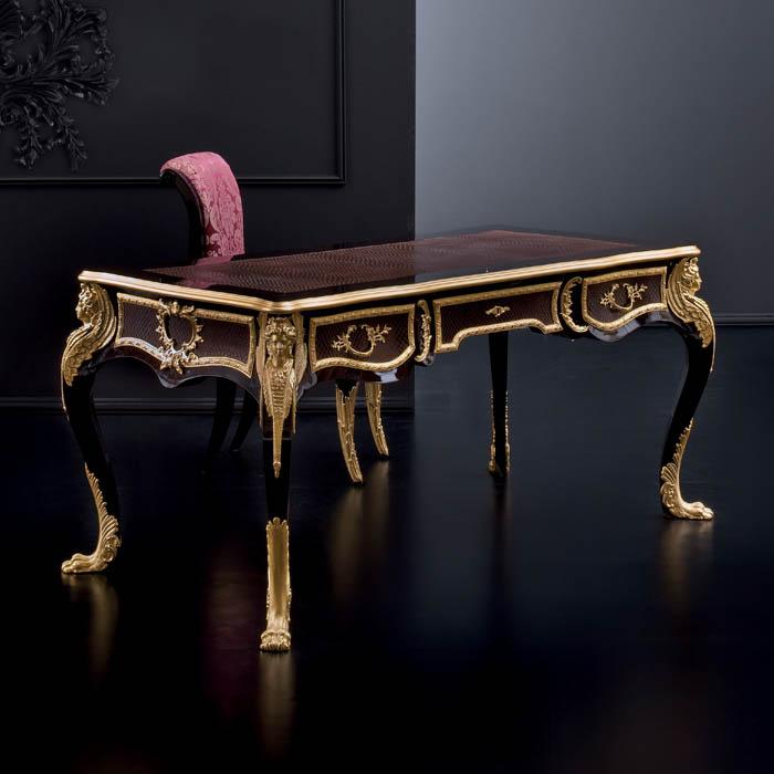 Desk Ebony inlay, top and drawers covered with printed snake leather, gold bronzes.