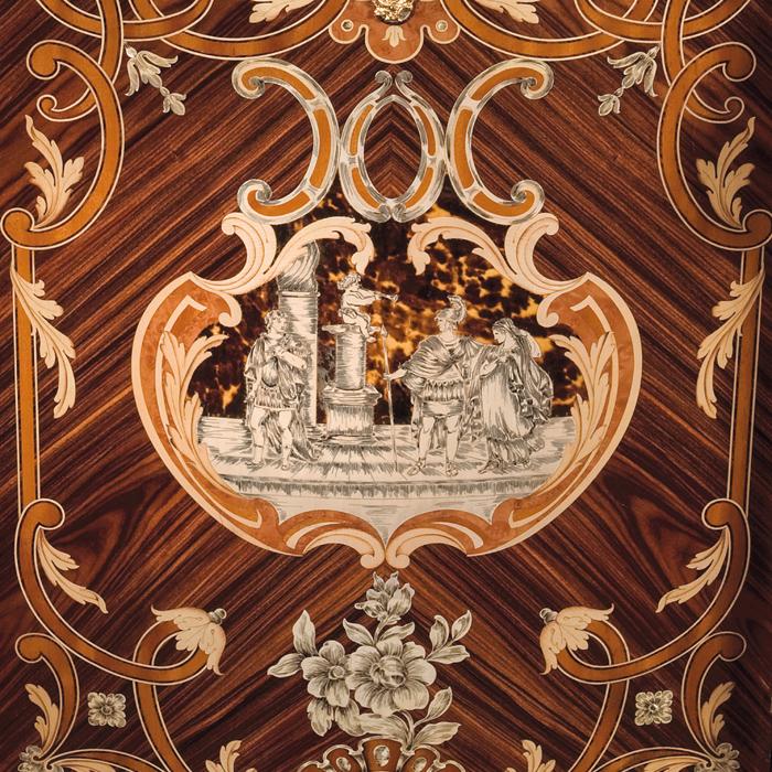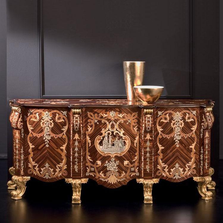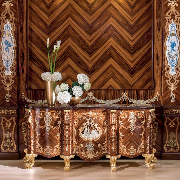 Sideboard veneer in rosewood, inlaid in rare woods, carved ivory and mother of pearl. Base, carved and gold leaf.