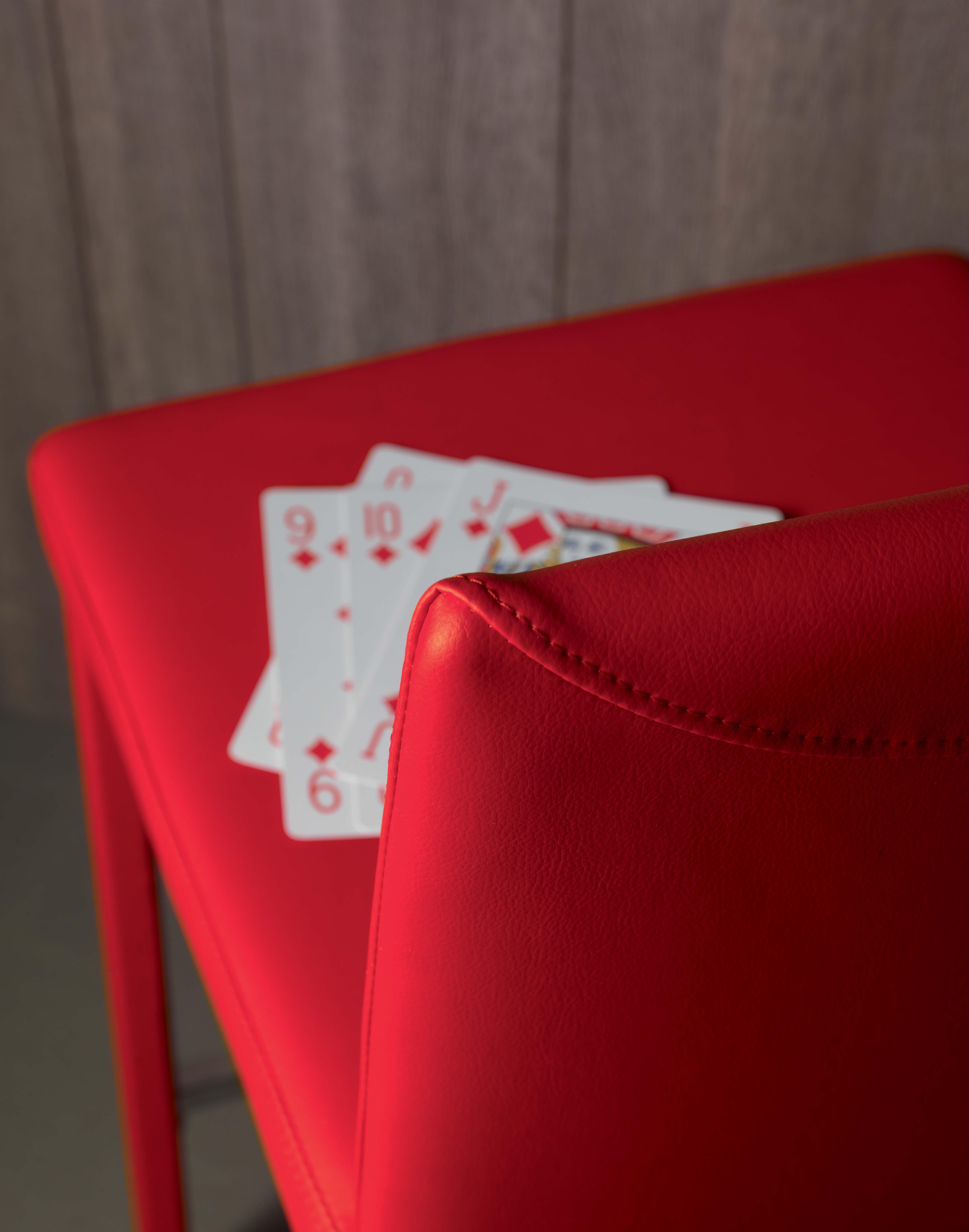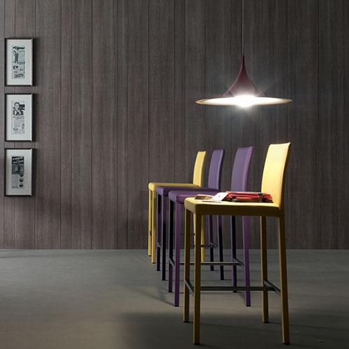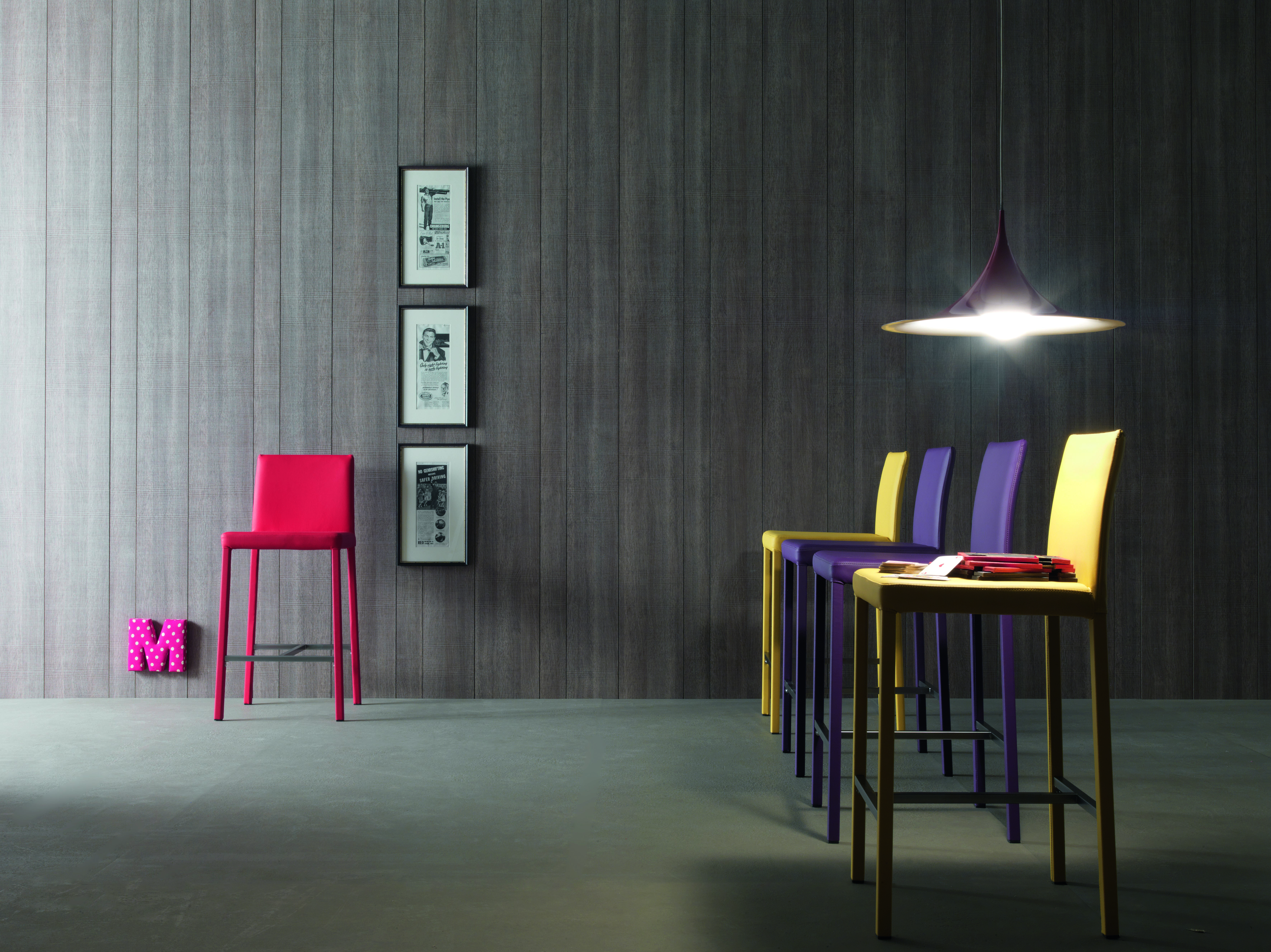 Stool with metal frame and brushed footrest, covered with dove grey, white, anthracite grey, moka, steel grey or violet regenerated leather or red, yellow, violet, white, ash grey, black or clay grey imitation leather.